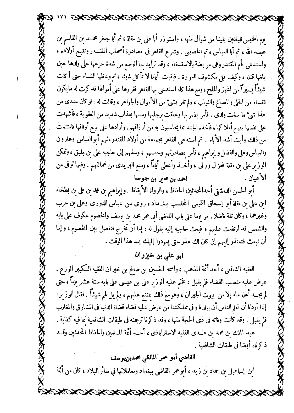 يوم الخميس لليلتين بقينا من شوال منها، واستوزر أبا على بن مقلة، ثم أبا جعفر محمد بن القاسم بن عبد الله، ثم أبا العباس، ثم الخصيبى. وَشَرَعَ الْقَاهِرُ فِي مُصَادَرَةِ أَصْحَابِ الْمُقْتَدِرِ وَتَتَبُّعِ أَوْلَادِهِ، وَاسْتَدْعَى بِأُمِّ الْمُقْتَدِرِ وَهِيَ مَرِيضَةٌ بِالِاسْتِسْقَاءِ، وَقَدْ تَزَايَدَ بِهَا الْوَجَعُ مِنْ شِدَّةِ جَزَعِهَا عَلَى وَلَدِهَا حِينَ بَلَغَهَا قَتْلُهُ، وَكَيْفَ بَقِيَ مَكْشُوفَ الْعَوْرَةِ. فَبَقِيَتْ أَيَّامًا لَا تَأْكُلُ شَيْئًا، ثُمَّ وَعَظَهَا النِّسَاءُ حَتَّى أَكَلَتْ شَيْئًا يَسِيرًا مِنَ الْخُبْزِ وَالْمِلْحِ، وَمَعَ هَذَا كُلِّهِ اسْتَدْعَى بِهَا الْقَاهِرُ فَقَرَّرَهَا عَلَى أَمْوَالِهَا فَذَكَرَتْ لَهُ مَا يَكُونُ لِلنِّسَاءِ مِنَ الْحُلِيِّ وَالْمَصَاغِ وَالثِّيَابِ، وَلَمْ تُقِرَّ بِشَيْءٍ مِنَ الْأَمْوَالِ وَالْجَوَاهِرِ، وَقَالَتْ لَهُ: لَوْ كَانَ عِنْدِي مِنْ هَذَا شَيْءٌ مَا سَلَّمْتُ وَلَدِي. فَأَمَرَ بِضَرْبِهَا وَعُلِّقَتْ بِرِجْلَيْهَا ومسها بعذاب شديد من العقوبة، فأشهدت عَلَى نَفْسِهَا بِبَيْعِ أَمْلَاكِهَا، فَأَخَذَهُ الْجُنْدُ مِمَّا يُحَاسِبُونَ بِهِ مِنْ أَرْزَاقِهِمْ. وَأَرَادَهَا عَلَى بَيْعِ أَوْقَافِهَا فَامْتَنَعَتْ مِنْ ذَلِكَ وَأَبَتْ أَشَدَّ الْإِبَاءِ. ثم استدعى الْقَاهِرُ بِجَمَاعَةٍ مِنْ أَوْلَادِ الْمُقْتَدِرِ مِنْهُمْ أَبُو العباس وَهَارُونُ وَالْعَبَّاسُ وَعَلِيٌّ وَالْفَضْلُ وَإِبْرَاهِيمُ، فَأَمَرَ بِمُصَادَرَتِهِمْ وحبسهم، وسلمهم إلى حاجبه على بن بليق، وتمكن الوزير عَلِيِّ بْنُ مُقْلَةَ فَعَزَلَ وَوَلَّى، وَأَخَذَ وَأَعْطَى أياما، ومنع البريدي من عمالتهم.