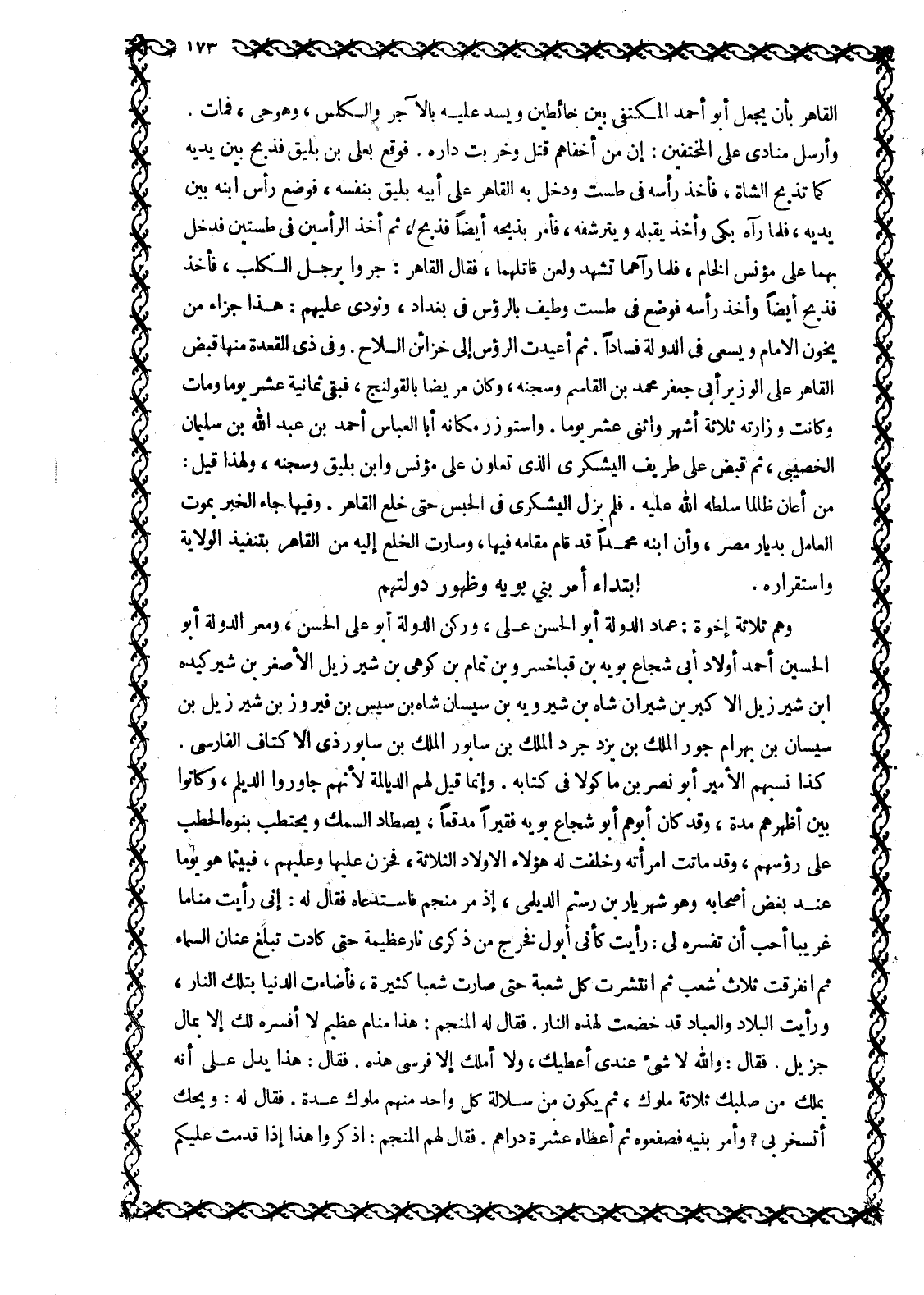 من أعان ظالما سلطه الله عليه. فلم يزل اليشكري في الحبس حَتَّى خُلِعَ الْقَاهِرُ. وَفِيهَا جَاءَ الْخَبَرُ بِمَوْتِ العامل بِدِيَارِ مِصْرَ، وَأَنَّ ابْنَهُ مُحَمَّدًا قَدْ قَامَ مقامه فيها، وسارت الخلع إليه من القاهر بتنفيذ الولاية واستقراره.