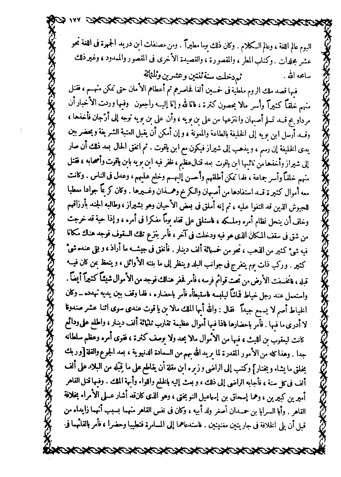 فِيهَا قَصَدَ مَلِكُ الرُّومِ مَلَطْيَةَ فِي خَمْسِينَ ألفا فحاصرهم ثُمَّ أَعْطَاهُمُ الْأَمَانَ حَتَّى تَمَكَّنَ مِنْهُمْ، فَقَتَلَ منهم خَلْقًا كَثِيرًا وَأَسَرَ مَا لَا يُحْصَوْنَ كَثْرَةً، ف إِنَّا لِلَّهِ وَإِنَّا إِلَيْهِ راجِعُونَ 2: 156. وَفِيهَا وَرَدَتِ الْأَخْبَارُ أن مَرْدَاوِيجَ قَدْ تَسَلَّمَ أَصْبَهَانَ وَانْتَزَعَهَا مِنْ عَلِيِّ بْنِ بُوَيْهِ، وَأَنَّ عَلِيَّ بْنَ بُوَيْهِ تَوَجَّهَ إِلَى أَرَّجَانَ فَأَخَذَهَا، وَقَدْ أَرْسَلَ ابْنُ بُوَيْهِ إلى الخليفة بِالطَّاعَةِ وَالْمَعُونَةِ، وَإِنْ أَمْكَنَ أَنْ يُقَبِّلَ الْعَتَبَةَ الشَّرِيفَةَ وَيَحْضُرَ بَيْنَ يَدَيِ الْخَلِيفَةِ إِنْ رَسَمَ، ويذهب إلى شيراز فيكون مع ابن يَاقُوتَ. ثُمَّ اتَّفَقَ الْحَالُ بَعْدَ ذَلِكَ أَنْ صار إلى شيراز وأخذها من نائبها ابن يَاقُوتَ بَعْدَ قِتَالٍ عَظِيمٍ، ظَفِرَ فِيهِ ابْنُ بويه بابن ياقوت وَأَصْحَابِهِ، فَقَتَلَ مِنْهُمْ خَلْقًا وَأَسَرَ جَمَاعَةً، فَلَمَّا تَمَكَّنَ أَطْلَقَهُمْ وَأَحْسَنَ إِلَيْهِمْ وَخَلَعَ عَلَيْهِمْ، وَعَدَلَ فِي النَّاسِ. وَكَانَتْ مَعَهُ أَمْوَالٌ كَثِيرَةٌ قَدِ استفادها من أصبهان والكرخ وهمذان وغيرها. وكان كريما جوادا معطيا لِلْجُيُوشِ الَّذِينَ قَدِ الْتَفُّوا عَلَيْهِ، ثُمَّ إِنَّهُ أَمْلَقَ فِي بَعْضِ الْأَحْيَانِ وَهُوَ بِشِيرَازَ، وَطَالَبَهُ الْجُنْدُ بِأَرْزَاقِهِمْ وَخَافَ أَنْ يَنْحَلَّ نِظَامُ أَمْرِهِ وملكه، فاستلقى على قفاه يوما مُفَكِّرًا فِي أَمْرِهِ، وَإِذَا حَيَّةٌ قَدْ خَرَجَتْ من شق في سَقْفِ الْمَكَانِ الَّذِي هُوَ فِيهِ وَدَخَلَتْ فِي آخَرَ، فَأَمَرَ بِنَزْعِ تِلْكَ السُّقُوفِ فَوَجَدَ هُنَاكَ مكانا فيه شيء كثير من الذهب، نَحْوٌ مِنْ خَمْسِمِائَةِ أَلْفِ دِينَارٍ. فَأَنْفَقَ فِي جَيْشِهِ مَا أَرَادَ، وَبَقِيَ عِنْدَهُ شَيْءٌ كَثِيرٌ. وركب ذات يوم يتفرج في جوانب البلد وينظر إلى ما بنته الأوائل، ويتعظ بمن كان فيه قبله، فانخسفت الأرض من تحت قوائم فرسه، فَأَمَرَ فَحُفِرَ هُنَالِكَ فَوَجَدَ مِنَ الْأَمْوَالِ شَيْئًا كَثِيرًا أَيْضًا.