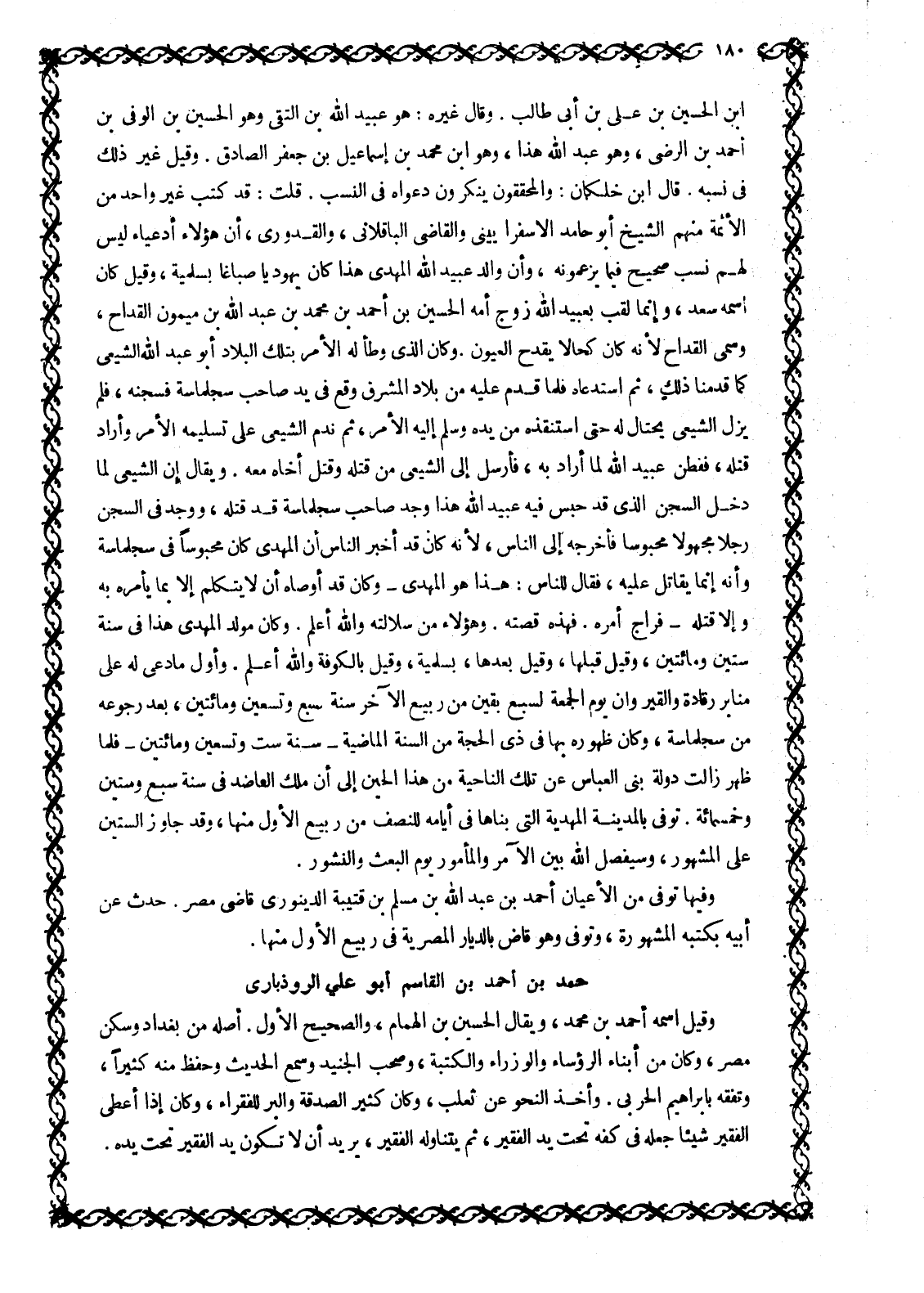 ابْنَ الْحُسَيْنِ بْنِ عَلِيِّ بْنِ أَبِي طَالِبٍ. وَقَالَ غَيْرُهُ: هُوَ عُبَيْدُ اللَّهِ بْنُ التَّقِيِّ وَهُوَ الحسين بن الوفي بن أحمد بن الرضى، وهو عبد الله هذا، وهو ابْنُ مُحَمَّدِ بْنِ إِسْمَاعِيلَ بْنِ جَعْفَرٍ الصَّادِقِ. وَقِيلَ غَيْرُ ذَلِكَ فِي نَسَبِهِ. قَالَ ابْنُ خَلِّكَانَ: وَالْمُحَقِّقُونَ يُنْكِرُونَ دَعْوَاهُ فِي النَّسَبِ. قُلْتُ: قَدْ كَتَبَ غَيْرُ وَاحِدٍ مِنَ الْأَئِمَّةِ مِنْهُمُ الشَّيْخُ أَبُو حَامِدٍ الْإِسْفَرَايِينِيُّ وَالْقَاضِي الْبَاقِلَّانِيُّ، وَالْقُدُورِيُّ، أَنَّ هَؤُلَاءِ أَدْعِيَاءُ لَيْسَ لَهُمْ نَسَبٌ صَحِيحٌ فِيمَا يَزْعُمُونَهُ، وَأَنَّ وَالِدَ عُبَيْدِ اللَّهِ المهدي هَذَا كَانَ يَهُودِيًّا صَبَّاغًا بِسَلَمْيَةَ، وَقِيلَ كَانَ اسمه سعد، وإنما لقب بعبيد الله زَوْجُ أُمِّهِ الْحُسَيْنَ بْنَ أَحْمَدَ بْنِ مُحَمَّدِ بْنِ عَبْدِ اللَّهِ بْنِ مَيْمُونٍ الْقَدَّاحَ، وَسُمِّي الْقَدَّاحَ لِأَنَّهُ كَانَ كَحَّالًا يَقْدَحُ الْعُيُونَ. وَكَانَ الَّذِي وَطَّأَ لَهُ الْأَمْرَ بِتِلْكَ الْبِلَادِ أَبُو عَبْدِ اللَّهِ الشِّيعِيُّ كَمَا قَدَّمْنَا ذَلِكَ، ثُمَّ استدعاه فلما قدم عليه مِنْ بِلَادِ الْمَشْرِقِ وَقَعَ فِي يَدِ صَاحِبِ سجلماسة فسجنه، فلم يزل الشيعي يحتال له حتى استنقذه من يده وسلم إليه الأمر، ثم ندم الشيعي على تسليمه الأمر وأراد قتله، ففطن عبيد الله لما أراد به، فأرسل إلى الشيعي من قتله وقتل أخاه معه. ويقال إن الشيعي لما دخل السجن الّذي قد حبس فيه عبيد الله هذا وَجَدَ صَاحِبَ سِجِلْمَاسَةَ قَدْ قَتَلَهُ، وَوَجَدَ فِي السجن رجلا مجهولا محبوسا فأخرجه إلى الناس، لأنه كان قد أخبر الناس أن المهدي كان محبوسا في سجلماسة وأنه إنما يقاتل عليه، فقال للناس: هذا هو المهدي- وكان قد أوصاه أن لا يتكلم إلا بما يأمره به وإلا قتله- فراج أمره. فهذه قصته. وهؤلاء من سلالته والله أعلم. وَكَانَ مَوْلِدُ الْمُهْدِيِّ هَذَا فِي سَنَةِ سِتِّينَ وَمِائَتَيْنِ، وَقِيلَ قَبْلَهَا، وَقِيلَ بَعْدَهَا، بِسَلَمْيَةَ، وَقِيلَ بالكوفة والله أعلم. وأول ما دعى له على منابر رفادة والقيروان يوم الجمعة لسبع بقين من ربيع الآخر سنة تسع وَتِسْعِينَ وَمِائَتَيْنِ، بَعْدَ رُجُوعِهِ مِنْ سِجِلْمَاسَةَ، وَكَانَ ظُهُورُهُ بِهَا فِي ذِي الْحِجَّةِ مِنَ السَّنَةِ الماضية- سنة ست وتسعين ومائتين- فلما ظهر زالت دولة بنى العباس عن تِلْكَ النَّاحِيَةِ مِنْ هَذَا الْحِينِ إِلَى أَنْ ملك القاصد في سنة سبع وستين وخمسمائة. توفى بالمدينة المهدية التي بناها في أيامه للنصف من ربيع الأول منها، وقد جاوز الستين على المشهور، وسيفصل الله بين الآمر والمأمور يوم البعث والنشور.