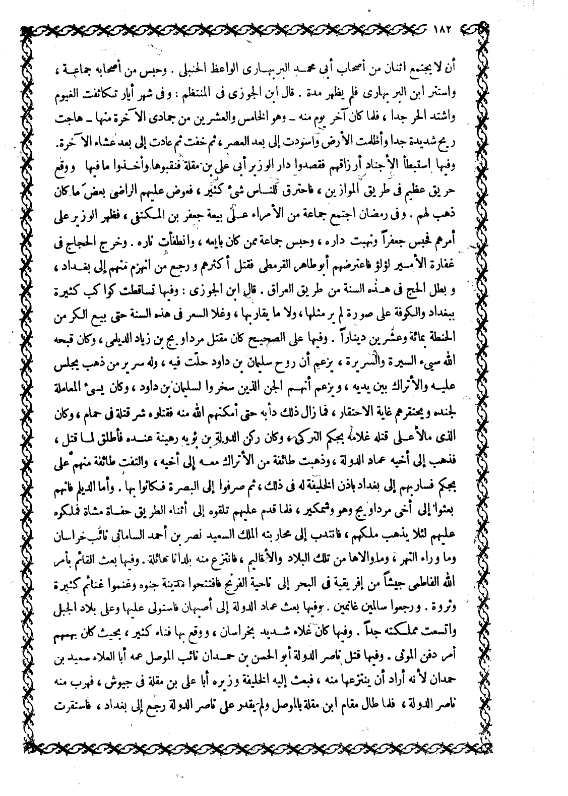 أَنْ لَا يَجْتَمِعُ اثْنَانِ مِنْ أَصْحَابِ أَبِي محمد البربهاري الواعظ الحنبلي. وحبس من أصحابه جماعة، واستتر ابن الْبَرْبَهَارِيُّ فَلَمْ يَظْهَرْ مُدَّةً. قَالَ ابْنُ الْجَوْزِيِّ فِي الْمُنْتَظَمِ: وَفِي شَهْرِ أَيَّارَ تَكَاثَفَتِ الْغُيُومُ وَاشْتَدَّ الْحَرُّ جِدًّا، فَلَمَّا كَانَ آخِرُ يَوْمٍ منه- وهو الخامس والعشرين من جمادى الآخرة منها- هاجت ريح شديدة جدا وأظلمت الأرض وَاسْوَدَّتْ إِلَى بَعْدِ الْعَصْرِ، ثُمَّ خَفَّتْ ثُمَّ عَادَتْ إِلَى بَعْدِ عَشَاءِ الْآخِرَةِ.
