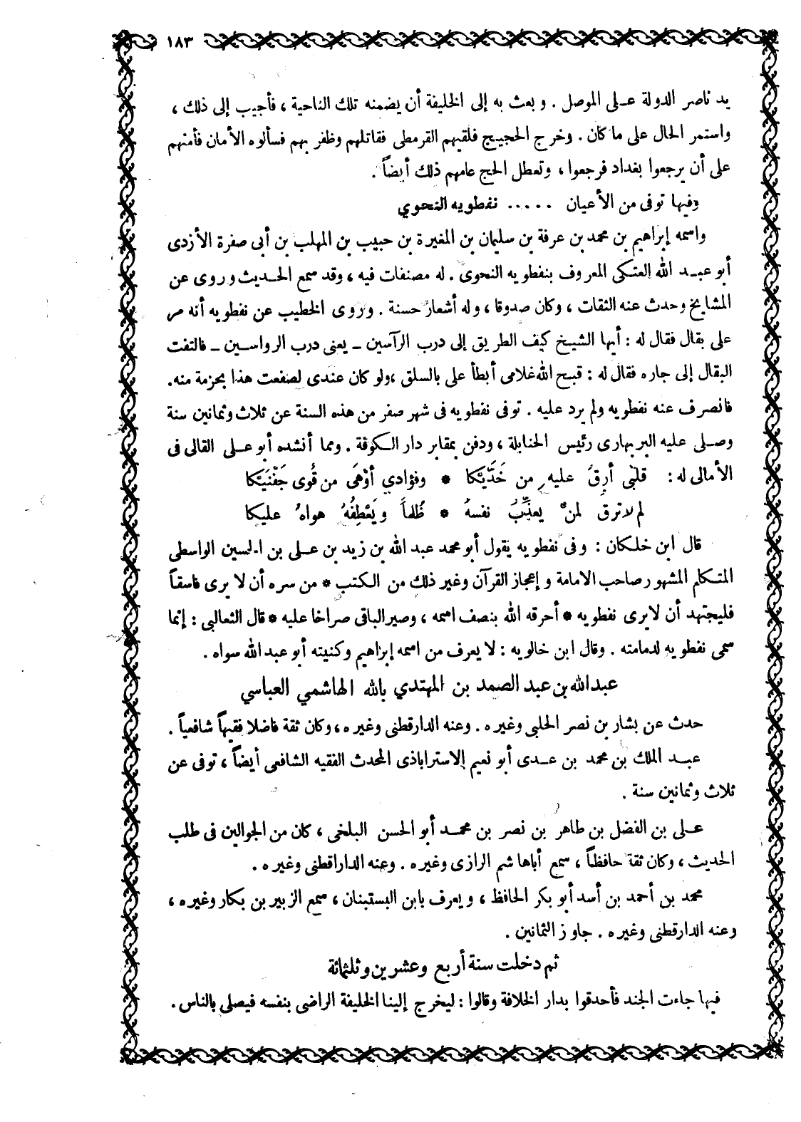 واسمه إِبْرَاهِيمُ بْنُ مُحَمَّدِ بْنِ عَرَفَةَ بْنِ سُلَيْمَانَ بْنِ الْمُغِيرَةِ بْنِ حَبِيبِ بْنِ الْمُهَلَّبِ بْنِ أَبِي صُفْرَةَ الْأَزْدِيُّ أَبُو عَبْدِ اللَّهِ الْعَتَكِيُّ الْمَعْرُوفُ بِنِفْطَوَيْهِ النَّحْوِيِّ. لَهُ مُصَنَّفَاتٌ فِيهِ، وَقَدْ سَمِعَ الْحَدِيثَ وَرَوَى عَنِ الْمَشَايِخِ وَحَدَّثَ عَنْهُ الثقات، وَكَانَ صَدُوقًا، وَلَهُ أَشْعَارٌ حَسَنَةٌ. وَرَوَى الْخَطِيبُ عن نفطويه أنه مر عَلَى بَقَّالٍ فَقَالَ لَهُ: أَيُّهَا الشَّيْخُ كَيْفَ الطريق إلى درب الرآسين- يَعْنِي دَرْبَ الرَّوَّاسِينَ- فَالْتَفَتَ الْبَقَّالُ إِلَى جَارِهِ فَقَالَ لَهُ: قَبَّحَ اللَّهُ غُلَامِي أَبْطَأَ عَلَيَّ بالسلق، ولو كان عندي لصفعت هذا بحزمة مِنْهُ.