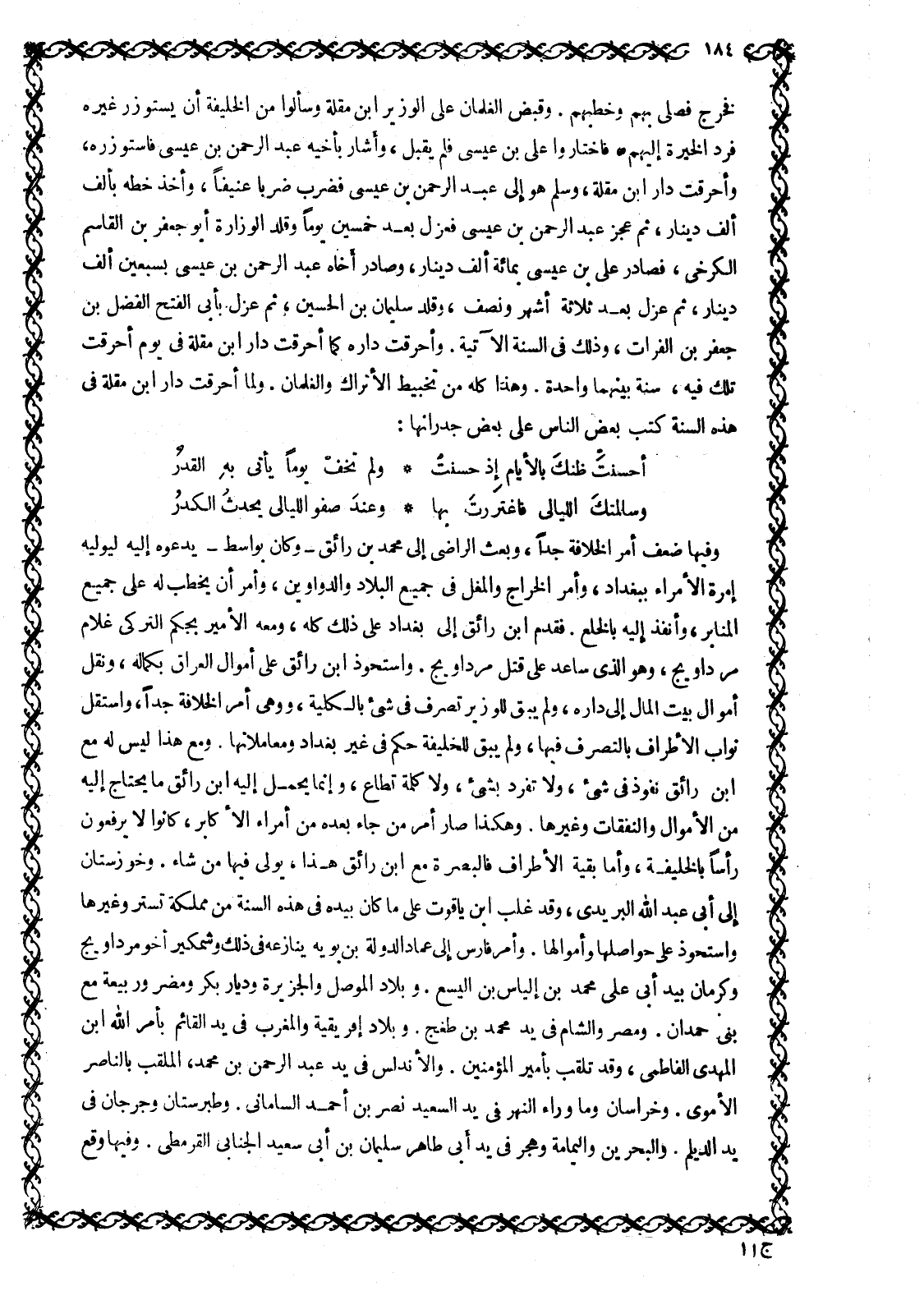 فَخَرَجَ فَصَلَّى بِهِمْ وَخَطَبَهُمْ. وَقَبَضَ الْغِلْمَانُ عَلَى الوزير ابن مُقْلَةَ وَسَأَلُوا مِنَ الْخَلِيفَةِ أَنْ يَسْتَوْزِرَ غَيْرَهُ فَرَدَّ الْخِيَرَةَ إِلَيْهِمْ، فَاخْتَارُوا عَلِيَّ بْنَ عِيسَى فَلَمْ يَقْبَلْ، وَأَشَارَ بِأَخِيهِ عَبْدِ الرَّحْمَنِ بْنِ عِيسَى فَاسْتَوْزَرَهُ، وَأُحْرِقَتْ دَارُ ابْنِ مُقْلَةَ، وَسُلِّمَ هُوَ إِلَى عَبْدِ الرَّحْمَنِ بْنِ عِيسَى فَضُرِبَ ضربا عنيفا، وأخذ خطبه بِأَلْفِ أَلْفِ دِينَارٍ، ثُمَّ عَجَزَ عَبْدُ الرَّحْمَنِ بْنُ عِيسَى فَعُزِلَ بَعْدَ خَمْسِينَ يَوْمًا وَقُلِّدَ الوزارة أبو جعفر بْنُ الْقَاسِمِ الْكَرْخِيُّ، فَصَادَرَ عَلِيَّ بْنَ عِيسَى بِمِائَةِ أَلْفِ دِينَارٍ، وَصَادَرَ أَخَاهُ عَبْدَ الرَّحْمَنِ بْنَ عِيسَى بِسَبْعِينَ أَلْفِ دِينَارٍ، ثُمَّ عُزِلَ بَعْدَ ثَلَاثَةِ أَشْهُرٍ وَنِصْفٍ، وَقُلِّدَ سُلَيْمَانُ بْنُ الْحُسَيْنِ، ثُمَّ عُزِلَ بِأَبِي الْفَتْحِ الْفَضْلِ بْنِ جعفر بن الفرات، وذلك فِي السَّنَةِ الْآتِيَةِ. وَأُحْرِقَتْ دَارُهُ كَمَا أُحْرِقَتْ دار ابن مقلة في يوم أحرقت تلك فيه، وسنة بينهما وَاحِدَةٌ. وَهَذَا كُلُّهُ مِنْ تَخْبِيطِ الْأَتْرَاكِ وَالْغِلْمَانِ. وَلَمَّا أُحْرِقَتْ دَارُ ابْنِ مُقْلَةَ فِي هَذِهِ السَّنَةِ كَتَبَ بَعْضُ النَّاسِ عَلَى بَعْضِ جُدْرَانِهَا: