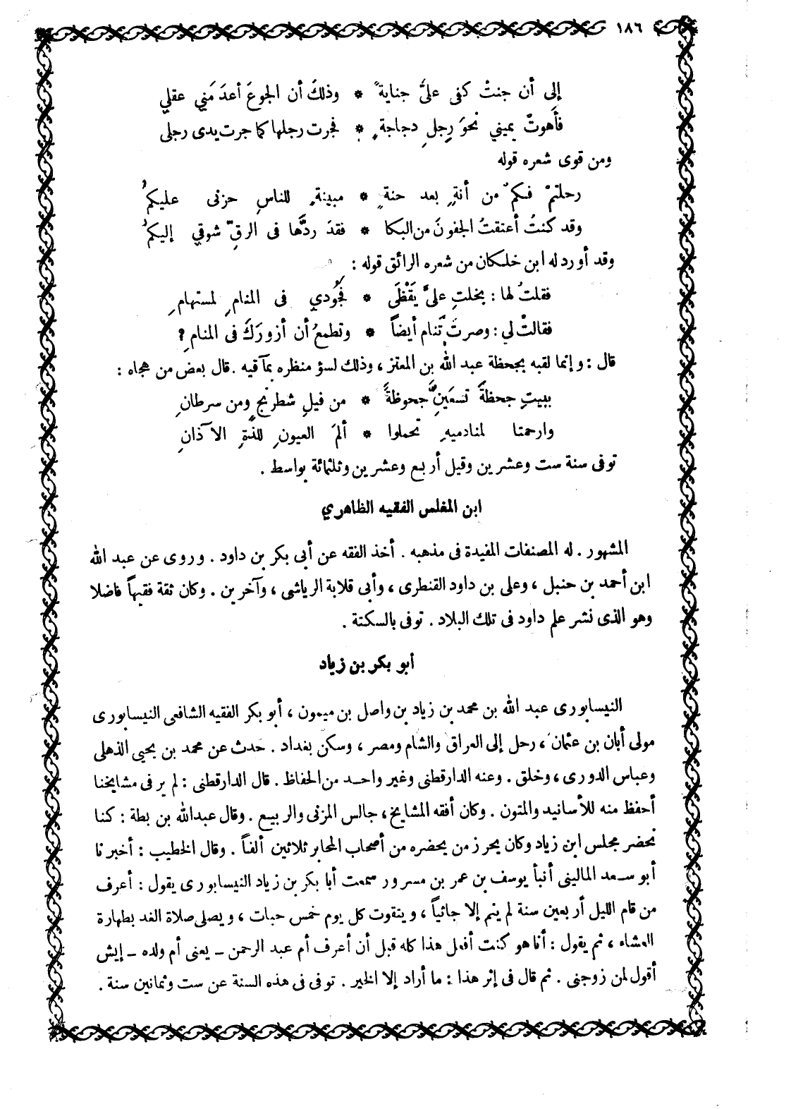 النَّيْسَابُورِيُّ عَبْدُ اللَّهِ بْنُ مُحَمَّدِ بْنِ زِيَادِ بْنِ وَاصِلِ بْنِ مَيْمُونٍ، أَبُو بَكْرٍ الْفَقِيهُ الشَّافِعِيُّ النَّيْسَابُورِيُّ مَوْلَى أَبَانِ بْنِ عُثْمَانَ، رَحَلَ إِلَى الْعِرَاقِ وَالشَّامِ وَمِصْرَ، وَسَكَنَ بَغْدَادَ. حدث عَنْ مُحَمَّدِ بْنِ يَحْيَى الذُّهْلِيِّ وَعَبَّاسٍ الدُّورِيِّ، وخلق. وعنه الدار قطنى وغير واحد من الحفاظ. قال الدار قطنى: لم ير فِي مَشَايِخِنَا أَحْفَظَ مِنْهُ لِلْأَسَانِيدِ وَالْمُتُونِ. وَكَانَ أفقه المشايخ، جالس المزني والربيع. وقال عَبْدِ اللَّهِ بْنُ بَطَّةَ: كُنَّا نَحْضُرُ مَجْلِسَ ابن زياد وكان يحرز مَنْ يَحْضُرُهُ مِنْ أَصْحَابِ الْمَحَابِرِ ثَلَاثِينَ أَلْفًا. وقال الخطيب: أخبرنا أبو سعد الماليني أنبأ يُوسُفُ بْنُ عُمَرَ بْنِ مَسْرُورٍ سَمِعْتُ أَبَا بَكْرِ بْنِ زِيَادٍ النَّيْسَابُورِيَّ يَقُولُ: أَعْرِفُ مَنْ قَامَ اللَّيْلَ أَرْبَعِينَ سَنَةً لَمْ يَنَمْ إِلَّا جائيا، وَيَتَقَوَّتْ كُلَّ يَوْمٍ خَمْسَ حَبَّاتٍ، وَيُصَلِّي صَلَاةَ الغد بطهارة العشاء، ثم يقول: أنا هو كنت أفعل هَذَا كُلُّهُ قَبْلَ أَنْ أَعْرِفَ أُمَّ عَبْدِ الرحمن- يعنى أم ولده- أَيْشِ أَقُولُ لِمَنْ زَوَّجَنِي. ثُمَّ قَالَ فِي إِثْرِ هَذَا: مَا أَرَادَ إِلَّا الْخَيْرَ. تُوُفِّيَ فِي هَذِهِ السَّنَةِ عَنْ سِتٍّ وَثَمَانِينَ سَنَةً.