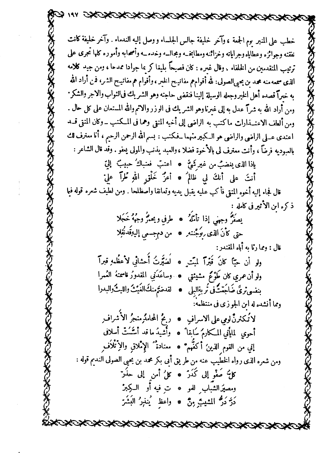 قَالَ فَجَاءَ إِلَيْهِ أَخُوهُ الْمُتَّقِي فَأَكَبَّ عَلَيْهِ يُقَبِّلُ يَدَيْهِ وَتَعَانَقَا وَاصْطَلَحَا. وَمِنْ لَطِيفِ شِعْرِهِ قوله فيما ذكره ابن الأثير في كامله: