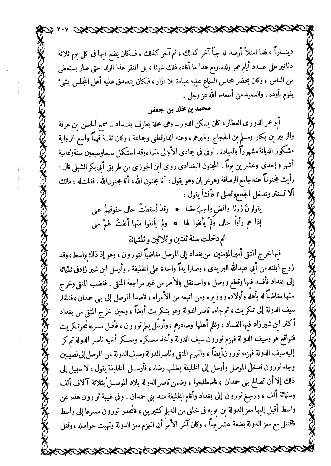أَبُو عُمَرَ الدُّورِيُّ الْعَطَّارُ، كَانَ يَسْكُنُ الدُّورَ- وَهِيَ مَحَلَّةٌ بِطَرَفِ بَغْدَادَ- سَمِعَ الْحَسَنَ بْنَ عَرَفَةَ وَالزُّبَيْرَ بْنَ بَكَّارٍ وَمُسْلِمَ بْنَ الْحَجَّاجِ وغيرهم، وعنه الدار قطنى وجماعة، وَكَانَ ثِقَةً فَهِمًا وَاسِعَ الرِّوَايَةِ مَشْكُورَ الدِّيَانَةِ مشهورا بالعبادة. توفى في جمادى الأولى منها، وقد استكمل سبعا وسبعين سنة وثمانية أشهر وإحدى وَعِشْرِينَ يَوْمًا. الْمَجْنُونُ الْبَغْدَادِيُّ رَوَى ابْنُ الْجَوْزِيِّ مِنْ طَرِيقِ أَبِي بَكْرٍ الشَّبْلِيِّ قَالَ: