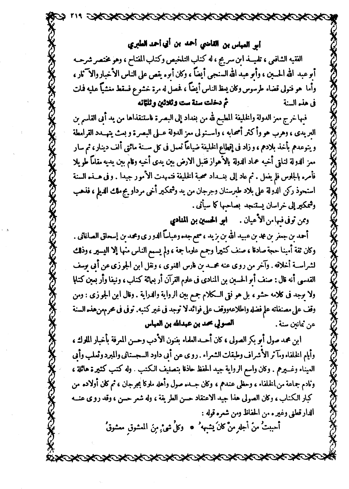 ابن مُحَمَّدِ بْنِ صُولٍ أَبُو بَكْرٍ الصُّولِيُّ، كَانَ أحد العلماء بفنون الأدب وحسن الْمَعْرِفَةِ بِأَخْبَارِ الْمُلُوكِ، وَأَيَّامِ الْخُلَفَاءِ وَمَآثِرِ الْأَشْرَافِ وَطَبَقَاتِ الشُّعَرَاءِ. رَوَى عَنْ أَبِي دَاوُدَ السِّجِسْتَانِيِّ وَالْمُبَرِّدِ وَثَعْلَبٍ وَأَبِي الْعَيْنَاءِ وَغَيْرِهِمْ. وَكَانَ وَاسِعَ الرِّوَايَةِ جَيِّدَ الْحِفْظِ حَاذِقًا بِتَصْنِيفِ الْكُتُبِ. وَلَهُ كُتُبٌ كَثِيرَةٌ هَائِلَةٌ، وَنَادَمَ جَمَاعَةً مِنَ الْخُلَفَاءِ، وَحَظِيَ عِنْدَهُمْ، وَكَانَ جَدُّهُ صُولٌ وَأَهْلُهُ مُلُوكًا بجرجان، ثم كان أولاده من كبار الْكُتَّابِ، وَكَانَ الصُّولِيُّ هَذَا جَيِّدَ الِاعْتِقَادِ حَسَنَ الطَّرِيقَةِ، وَلَهُ شِعْرٌ حَسَنٌ، وَقَدْ رَوَى عَنْهُ الدار قطنى وَغَيْرُهُ مِنَ الْحُفَّاظِ وَمِنْ شَعْرِهِ قَوْلُهُ: