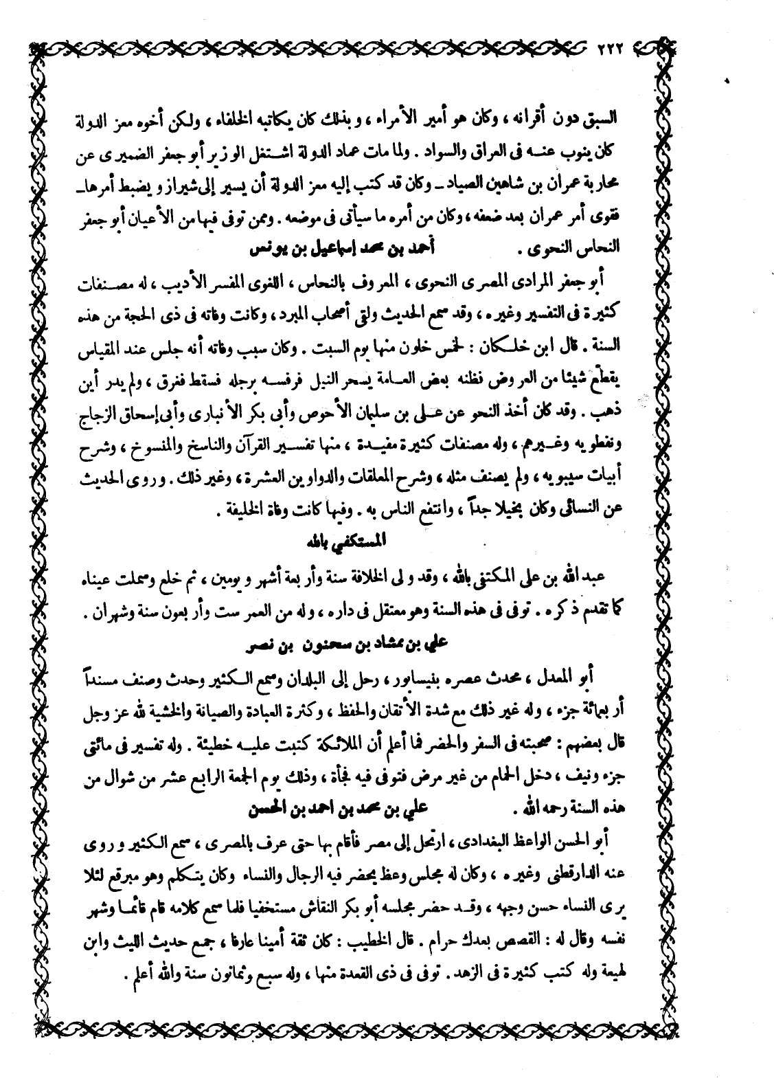 أَبُو جَعْفَرٍ الْمُرَادِيُّ الْمِصْرِيُّ النَّحْوِيُّ، الْمَعْرُوفُ بِالنَّحَّاسِ، اللُّغَوِيِّ الْمُفَسِّرِ الْأَدِيبِ، لَهُ مُصَنَّفَاتٌ كَثِيرَةٌ فِي التَّفْسِيرِ وَغَيْرِهِ، وَقَدْ سَمِعَ الْحَدِيثَ وَلَقِيَ أَصْحَابَ الْمُبَرِّدِ، وَكَانَتْ وَفَاتُهُ فِي ذِي الْحِجَّةِ مِنْ هَذِهِ السَّنَةِ. قَالَ ابْنُ خَلِّكَانَ: لِخَمْسٍ خَلَوْنَ مِنْهَا يَوْمَ السَّبْتِ. وَكَانَ سَبَبُ وَفَاتِهِ أَنَّهُ جَلَسَ عِنْدَ الْمِقْيَاسِ يُقَطِّعُ شَيْئًا مِنَ الْعَرُوضِ فَظَنَّهُ بَعْضُ الْعَامَّةِ يَسْحَرُ النيل فَرَفَسَهُ بِرِجْلِهِ فَسَقَطَ فَغَرِقَ، وَلَمْ يُدْرَ أَيْنَ ذهب. وقد كان أخذ النحو عن على بن سليمان الأحوص وأبى بكر الْأَنْبَارِيِّ وَأَبِي إِسْحَاقَ الزَّجَّاجِ وَنَفْطَوَيْهِ وَغَيْرِهِمْ، وَلَهُ مصنفات كثيرة مفيدة، منها تفسير القرآن والناسخ والمنسوخ، وشرح أبيات سيبويه، ولم يصنف مثله، وشرح المعلقات والدواوين الْعَشَرَةُ، وَغَيْرُ ذَلِكَ. وَرَوَى الْحَدِيثَ عَنِ النَّسَائِيِّ وكان بخيلا جدا، وانتفع الناس به. وَفِيهَا كَانَتْ وَفَاةُ الْخَلِيفَةِ.