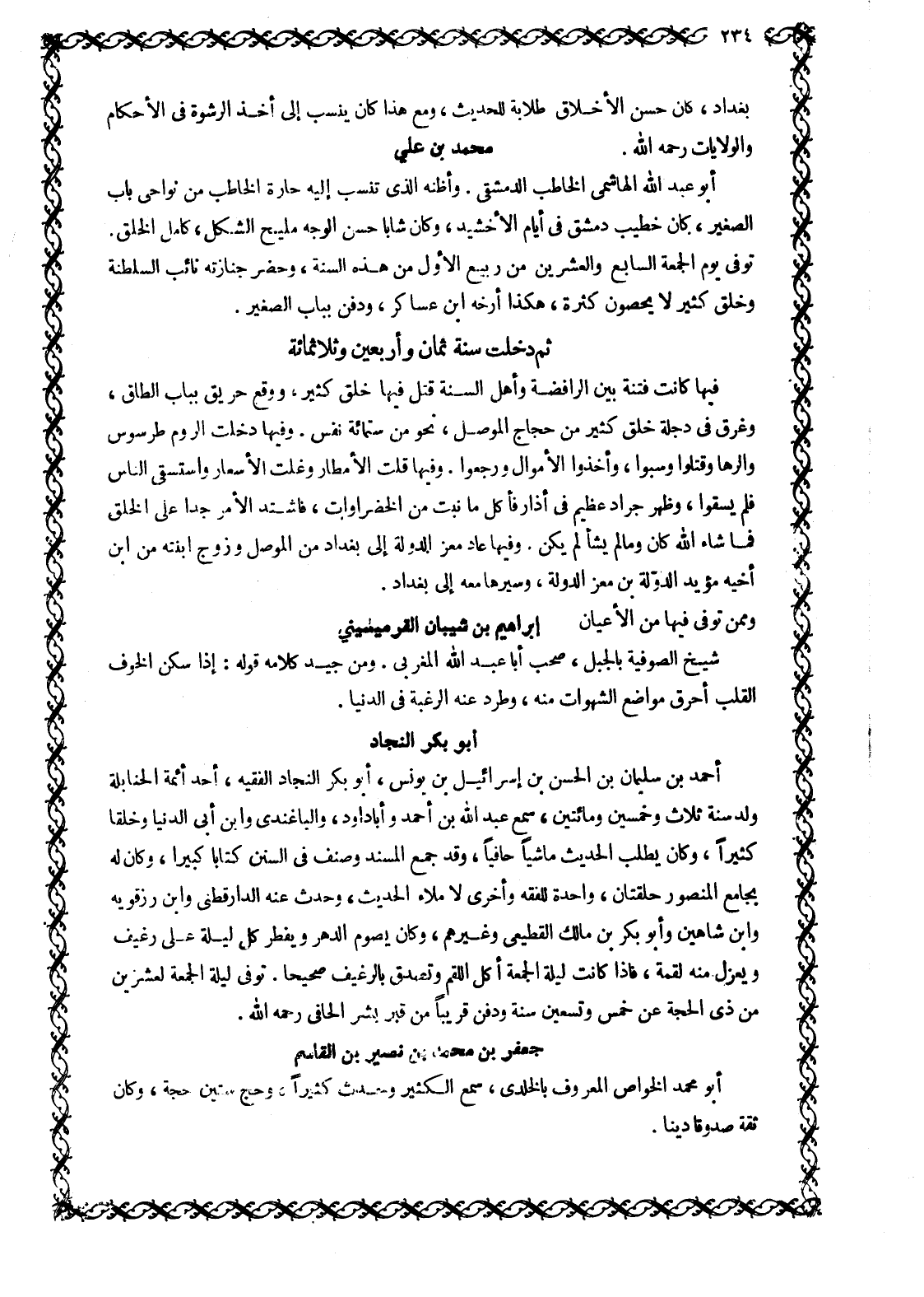 أحمد بن سليمان بْنِ الْحَسَنِ بْنِ إِسْرَائِيلَ بْنِ يُونُسَ، أَبُو بَكْرٍ النَّجَّادُ الْفَقِيهُ، أَحَدُ أَئِمَّةِ الْحَنَابِلَةِ وُلِدَ سَنَةَ ثَلَاثٍ وَخَمْسِينَ وَمِائَتَيْنِ، سَمِعَ عَبْدَ اللَّهِ بْنَ أَحْمَدَ وَأَبَا دَاوُدَ، وَالْبَاغَنْدِيَّ وَابْنَ أَبِي الدُّنْيَا وَخَلْقًا كَثِيرًا، وَكَانَ يَطْلُبُ الْحَدِيثَ مَاشِيًا حَافِيًا، وَقَدْ جَمَعَ الْمُسْنَدَ وَصَنَّفَ فِي السُّنَنِ كتابا كبيرا، وكان له يجامع المنصور حلقتان، واحدة للفقه وأخرى لا ملاء الحديث، وحدث عنه الدار قطنى وَابْنُ رِزْقَوَيْهِ وَابْنُ شَاهِينَ وَأَبُو بَكْرِ بْنُ مَالِكٍ الْقَطِيعِيُّ وَغَيْرُهُمْ، وَكَانَ يَصُومُ الدَّهْرَ وَيُفْطِرُ كُلَّ لَيْلَةٍ عَلَى رَغِيفٍ وَيَعْزِلُ مِنْهُ لُقْمَةً، فإذا كانت ليلة الجمعة أكل اللقم وتصدق بالرغيف صحيحا. توفى ليلة الجمعة لعشرين مِنْ ذِي الْحِجَّةِ عَنْ خَمْسٍ وَتِسْعِينَ سَنَةً ودفن قريبا من قبر بشر الْحَافِي رَحِمَهُ اللَّهُ.