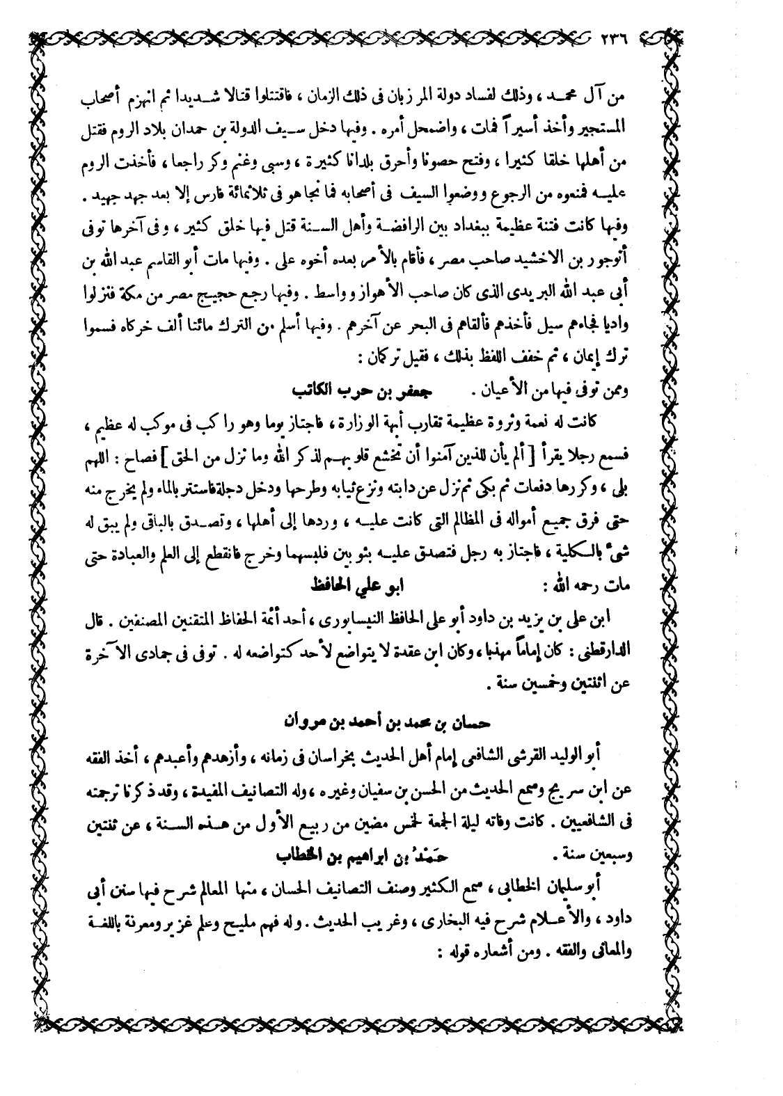 مِنْ آلِ مُحَمَّدٍ، وَذَلِكَ لِفَسَادِ دَوْلَةِ الْمَرْزُبَانِ في ذلك الزمان، فاقتتلوا قتالا شديدا ثُمَّ انْهَزَمَ أَصْحَابُ الْمُسْتَجِيرِ وَأُخِذَ أَسِيرًا فَمَاتَ، واضمحل أمره. وَفِيهَا دَخَلَ سَيْفُ الدَّوْلَةِ بْنُ حَمْدَانَ بِلَادَ الرُّومِ فَقَتَلَ مِنْ أَهْلِهَا خَلْقًا كَثِيرًا، وَفَتَحَ حصونا وأحرق بلدانا كثيرة، وسبى وغنم وكر راجعا، فأخذت الروم عليه فَمَنَعُوهُ مِنَ الرُّجُوعِ وَوَضَعُوا السَّيْفَ فِي أَصْحَابِهِ فما نجا هو فِي ثَلَاثِمِائَةِ فَارِسٍ إِلَّا بَعْدَ جَهْدٍ جَهِيدٍ.