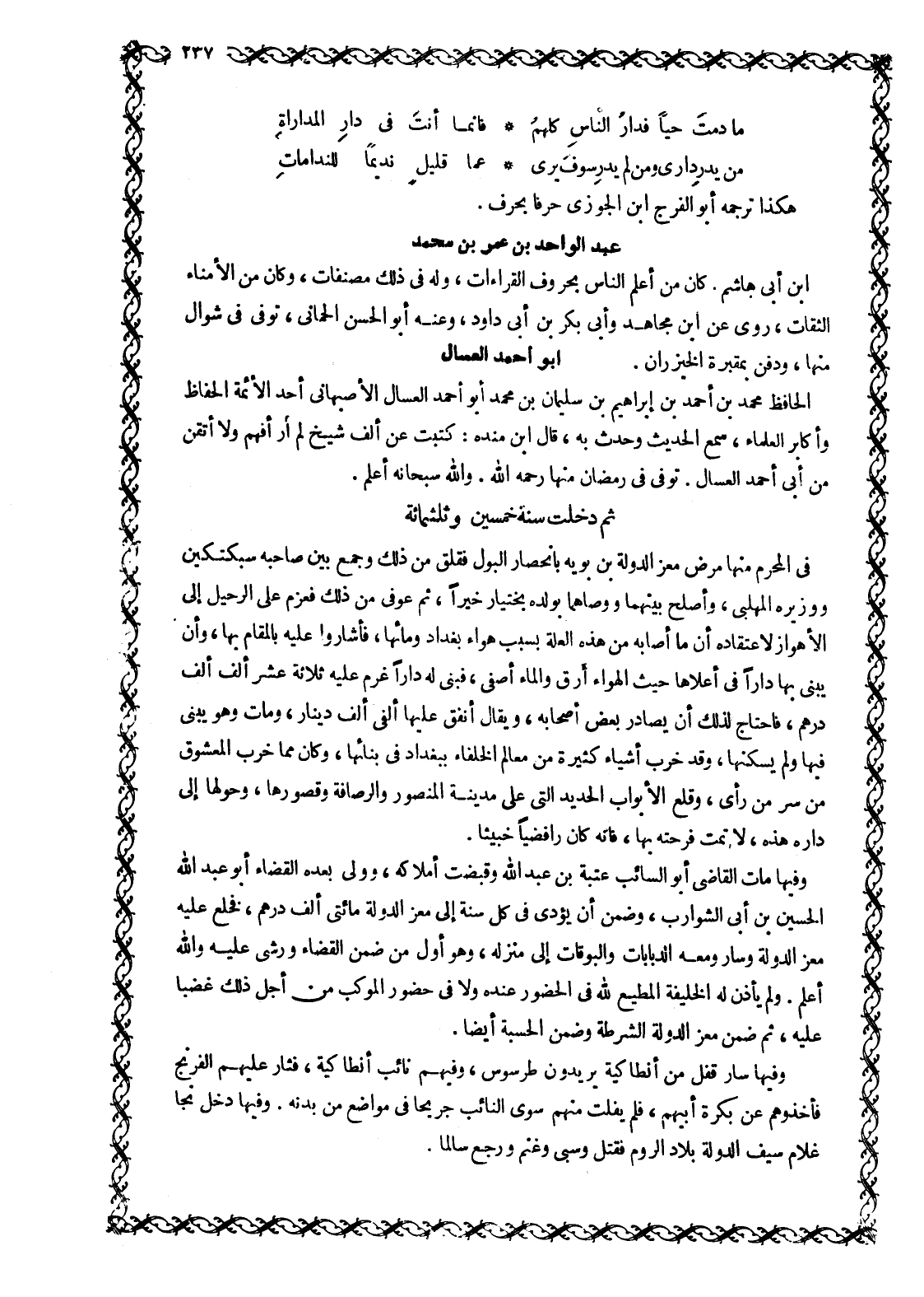 فِي الْمُحَرَّمِ مِنْهَا مَرِضَ مُعِزُّ الدَّوْلَةِ بْنُ بُوَيْهِ بِانْحِصَارِ الْبَوْلِ فَقَلِقَ مِنْ ذَلِكَ وَجَمَعَ بين صاحبه سُبُكْتِكِينَ وَوَزِيرِهِ الْمُهَلَّبِيِّ، وَأَصْلَحَ بَيْنَهُمَا وَوَصَّاهُمَا بِوَلَدِهِ بَخْتِيَارَ خَيْرًا، ثُمَّ عُوفِيَ مِنْ ذَلِكَ فَعَزَمَ على الرحيل إلى الأهواز لاعتقاده أن ما أصابه من هذه العلة بسبب هواء بغداد ومائها، فأشاروا عَلَيْهِ بِالْمُقَامِ بِهَا، وَأَنْ يَبْنِيَ بِهَا دَارًا فِي أَعْلَاهَا حَيْثُ الْهَوَاءُ أَرَقُّ وَالْمَاءُ أَصْفَى، فبنى له دارا غرم عليه ثَلَاثَةَ عَشَرَ أَلْفَ أَلْفِ دِرْهَمٍ، فَاحْتَاجَ لِذَلِكَ أن يصادر بعض أصحابه، ويقال أنفق عليها أَلْفَيْ أَلْفِ دِينَارٍ، وَمَاتَ وَهُوَ يَبْنِي فِيهَا ولم يسكنها، وقد خرب القفصي كثيرة من معالم الخلفاء ببغداد في بنائها، وكان مما خرب المعشوق من سرمن رَأَى، وَقَلَعَ الْأَبْوَابَ الْحَدِيدَ الَّتِي عَلَى مَدِينَةِ المنصور والرصافة وقصورها، وَحَوَّلَهَا إِلَى دَارِهِ هَذِهِ، لَا تَمَّتْ فَرْحَتُهُ بها، فإنه كان رافضيا خبيثا.
