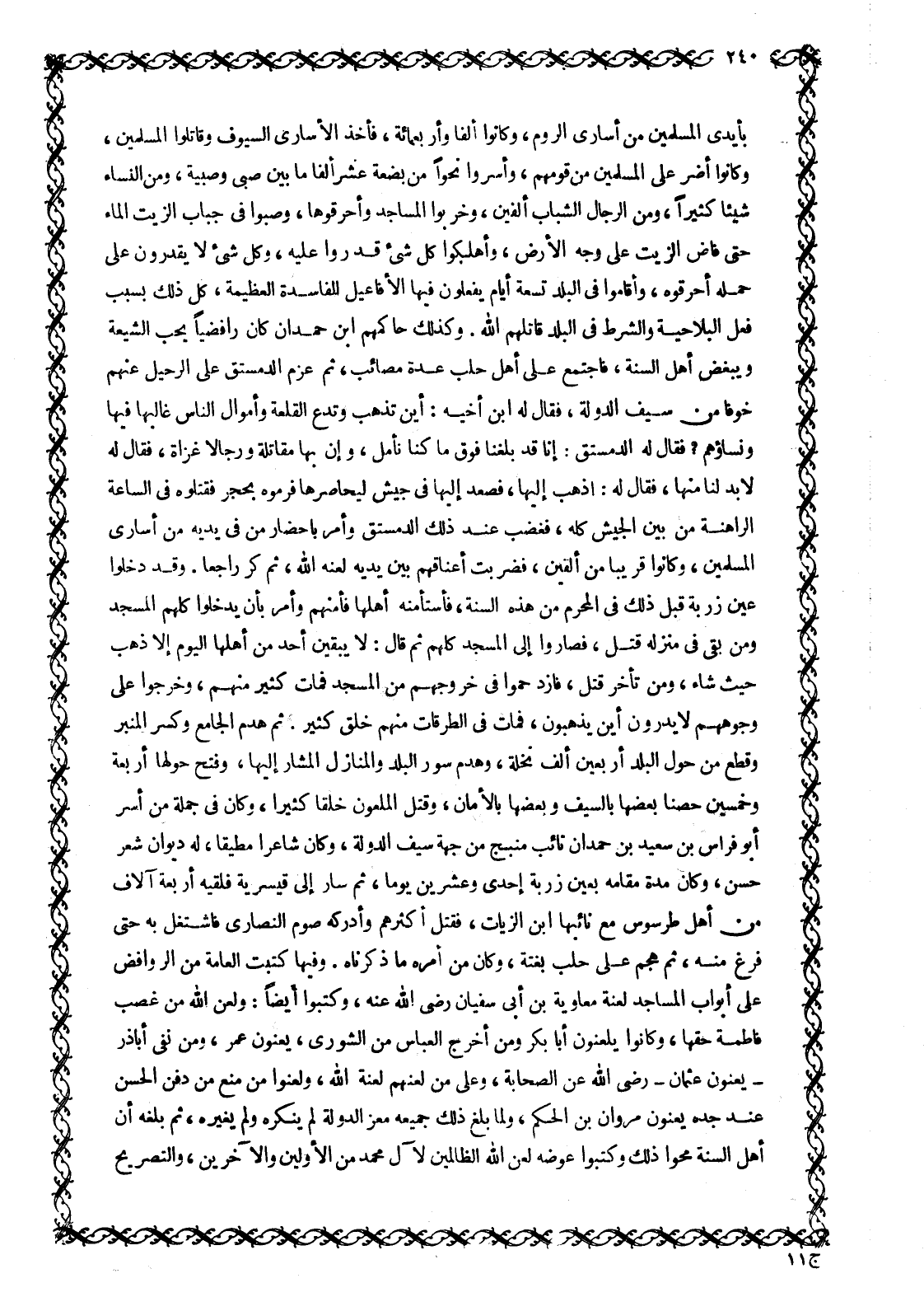 بِأَيْدِي الْمُسْلِمِينَ مِنْ أُسَارَى الرُّومِ، وَكَانُوا أَلْفًا وأربعمائة، فأخذ الأسارى السيوف وقاتلوا المسلمين، وكانوا أضر على المسلمين من قومهم، وَأَسَرُوا نَحْوًا مِنْ بِضْعَةَ عَشَرَ أَلْفًا مَا بَيْنَ صَبِيٍّ وَصَبِيَّةٍ، وَمِنَ النِّسَاءِ شَيْئًا كَثِيرًا، ومن الرجال الشباب أَلْفَيْنِ، وَخَرَّبُوا الْمَسَاجِدَ وَأَحْرَقُوهَا، وَصَبُّوا فِي جِبَابِ الزَّيْتِ الْمَاءَ حَتَّى فَاضَ الزَّيْتُ عَلَى وَجْهِ الأرض، وأهلكوا كل شيء قدروا عليه، وَكُلُّ شَيْءٍ لَا يَقْدِرُونَ عَلَى حَمْلِهِ أَحْرَقُوهُ، وأقاموا في البلد تسعة أيام يفعلون فيها الأفاعيل الفاسدة العظيمة، كل ذلك بسبب فعل البلاحية والشرط في البلد قاتلهم الله. وكذلك حاكمهم ابن حمدان كان رافضيا يحب الشيعة ويبغض أهل السنة، فاجتمع على أهل حلب عدة مصائب، ثم عزم الدمستق على الرحيل عنهم خوفا من سيف الدولة، فقال له ابن أخيه: أين تذهب وتدع القلعة وأموال الناس غالبها فيها ونساؤهم؟ فقال له الدمستق: إنا قد بلغنا فوق ما كنا نأمل، وإن بها مقاتلة ورجالا غزاة، فقال له لَا بُدَّ لَنَا مِنْهَا، فَقَالَ لَهُ: اذْهَبْ إليها، فصعد إليها في جيش ليحاصرها فرموه بحجر فقتلوه فِي السَّاعَةِ الرَّاهِنَةِ مِنْ بَيْنِ الْجَيْشِ كُلِّهِ، فغضب عند ذلك الدمستق وأمر بإحضار من في يديه مِنْ أَسَارَى الْمُسْلِمِينَ، وَكَانُوا قَرِيبًا مِنْ أَلْفَيْنِ، فضربت أعناقهم بين يديه لعنه الله، ثم كر راجعا. وَقَدْ دَخَلُوا عَيْنَ زَرْبَةَ قَبْلَ ذَلِكَ فِي المحرم من هذه السنة، فأستأمنه أهلها فأمنهم وأمر بأن يدخلوا كلهم المسجد ومن بقي في منزله قتل، فصاروا إلى المسجد كلهم ثم قال: لا يبقين أحد من أهلها الْيَوْمَ إِلَّا ذَهَبَ حَيْثُ شَاءَ، وَمَنْ تَأَخَّرَ قُتِلَ، فَازْدَحَمُوا فِي خُرُوجِهِمْ مِنَ الْمَسْجِدِ فَمَاتَ كَثِيرٌ مِنْهُمْ، وَخَرَجُوا عَلَى وُجُوهِهِمْ لَا يَدْرُونَ أَيْنَ يَذْهَبُونَ، فَمَاتَ فِي الطُّرُقَاتِ مِنْهُمْ خَلْقٌ كَثِيرٌ. ثُمَّ هَدَمَ الْجَامِعَ وَكَسَرَ الْمِنْبَرَ وَقَطَعَ مِنْ حَوْلِ الْبَلَدِ أَرْبَعِينَ أَلْفَ نَخْلَةٍ، وَهَدَمَ سور البلد والمنازل المشار إليها، وَفَتَحَ حَوْلَهَا أَرْبَعَةً وَخَمْسِينَ حِصْنًا بَعْضُهَا بِالسَّيْفِ وبعضها بالأمان، وقتل الملعون خلقا كثيرا، وكان في جملة من أسر أبو فراس بن سعيد بن حمدان تائب مَنْبِجَ مِنْ جِهَةِ سَيْفِ الدَّوْلَةِ، وَكَانَ شَاعِرًا مطيقا، له ديوان شعر حسن، وكان مدة مقامه بعين زربة إحدى وعشرين يوما، ثم سار إلى قيسرية فَلَقِيَهُ أَرْبَعَةُ آلَافٍ مِنْ أَهْلِ طَرَسُوسَ مَعَ نَائِبِهَا ابْنِ الزَّيَّاتِ، فَقَتَلَ أَكْثَرَهُمْ وَأَدْرَكَهُ صَوْمُ النَّصَارَى فَاشْتَغَلَ بِهِ حَتَّى فَرَغَ مِنْهُ، ثُمَّ هجم على حلب بغتة، وكان من أمره ما ذكرناه. وفيها كَتَبَتِ الْعَامَّةُ مِنَ الرَّوَافِضِ عَلَى أَبْوَابِ الْمَسَاجِدِ لعنة مُعَاوِيَةَ بْنِ أَبِي سُفْيَانَ رَضِيَ اللَّهُ عَنْهُ، وكتبوا أيضا: ولعن الله من غصب فاطمة حقها، وكانوا يلعنون أبا بكر وَمَنْ أَخْرَجَ الْعَبَّاسَ مِنَ الشُّورَى، يَعْنُونَ عُمَرَ، وَمَنْ نَفَى أَبَا ذَرٍّ- يَعْنُونَ عُثْمَانَ- رَضِيَ الله عن الصحابة، وعلى من لعنهم لعنة الله، ولعنوا من منع من دَفْنَ الْحَسَنِ عِنْدَ جَدِّهِ يَعْنُونَ مَرْوَانَ بْنَ الحكم، ولما بلغ ذلك جميعه مُعِزَّ الدَّوْلَةِ لَمْ يُنْكِرْهُ وَلَمْ يُغَيِّرْهُ، ثُمَّ بلغه أن أهل السنة محوا ذلك وكتبوا عوضه لَعَنَ اللَّهُ الظَّالِمِينَ لِآلِ مُحَمَّدٍ مِنَ الْأَوَّلِينَ والآخرين، والتصريح