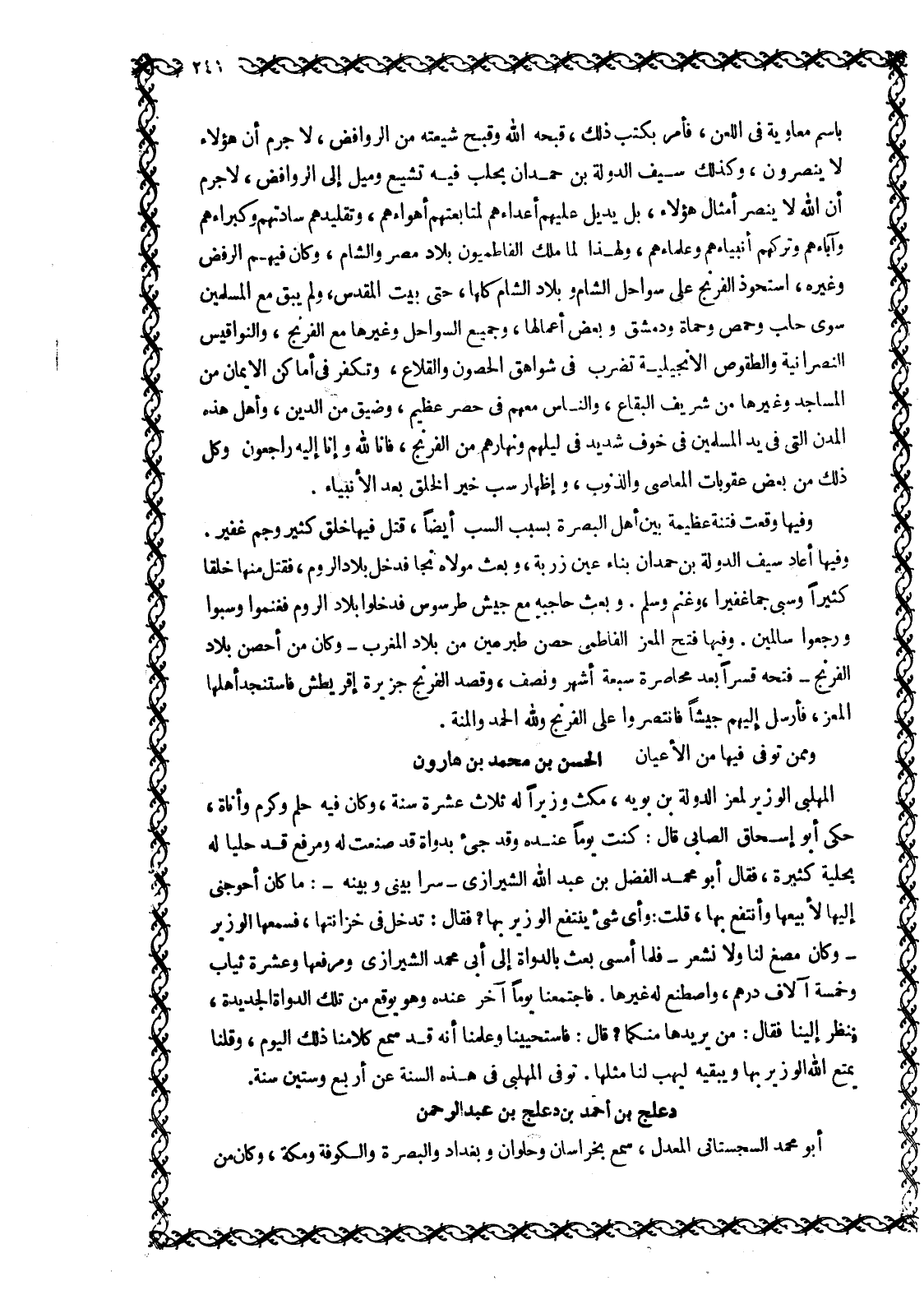 الْمُهَلَّبِيُّ الْوَزِيرُ لِمُعِزِّ الدَّوْلَةِ بْنِ بُوَيْهِ، مَكَثَ وزيرا له ثَلَاثَ عَشْرَةَ سَنَةً، وَكَانَ فِيهِ حِلْمٌ وَكَرَمٌ وأناة، حكى أبو إسحاق الصابي قَالَ: كُنْتُ يَوْمًا عِنْدَهُ وَقَدْ جِيءَ بِدَوَاةٍ قد صنعت له ومرفع قد حليا له بحلية كثيرة، فقال أبو محمد الفضل بن عبد الله الشِّيرَازِيُّ- سِرًّا بَيْنِي وَبَيْنَهُ-: مَا كَانَ أَحْوَجَنِي إليها لأبيعها وأنتفع بها، قلت: وأي شيء ينتفع الوزير بها؟ فقال: تدخل في خزانتها، فسمعها الوزير- وكان مصغ لنا وَلَا نَشْعُرُ- فَلَمَّا أَمْسَى بَعَثَ بِالدَّوَاةِ إِلَى أَبِي مُحَمَّدٍ الشِّيرَازِيِّ وَمِرْفَعِهَا وَعَشْرَةِ ثِيَابٍ وَخَمْسَةِ آلَافِ دِرْهَمٍ، وَاصْطَنَعَ لَهُ غَيْرَهَا. فَاجْتَمَعْنَا يَوْمًا آخَرَ عِنْدَهُ وَهُوَ يُوَقِّعُ مِنْ تِلْكَ الدَّوَاةِ الجديدة، فنظر إلينا فقال: من يريدها منكما؟ قال: فاستحيينا وعلمنا أنه قد سمع كلامنا ذلك اليوم، وقلنا يمنع الله الوزير بها ويبقيه ليهب لنا مثلها. توفى الْمُهَلَّبِيُّ فِي هَذِهِ السَّنَةِ عَنْ أَرْبَعٍ وَسِتِّينَ سَنَةً.