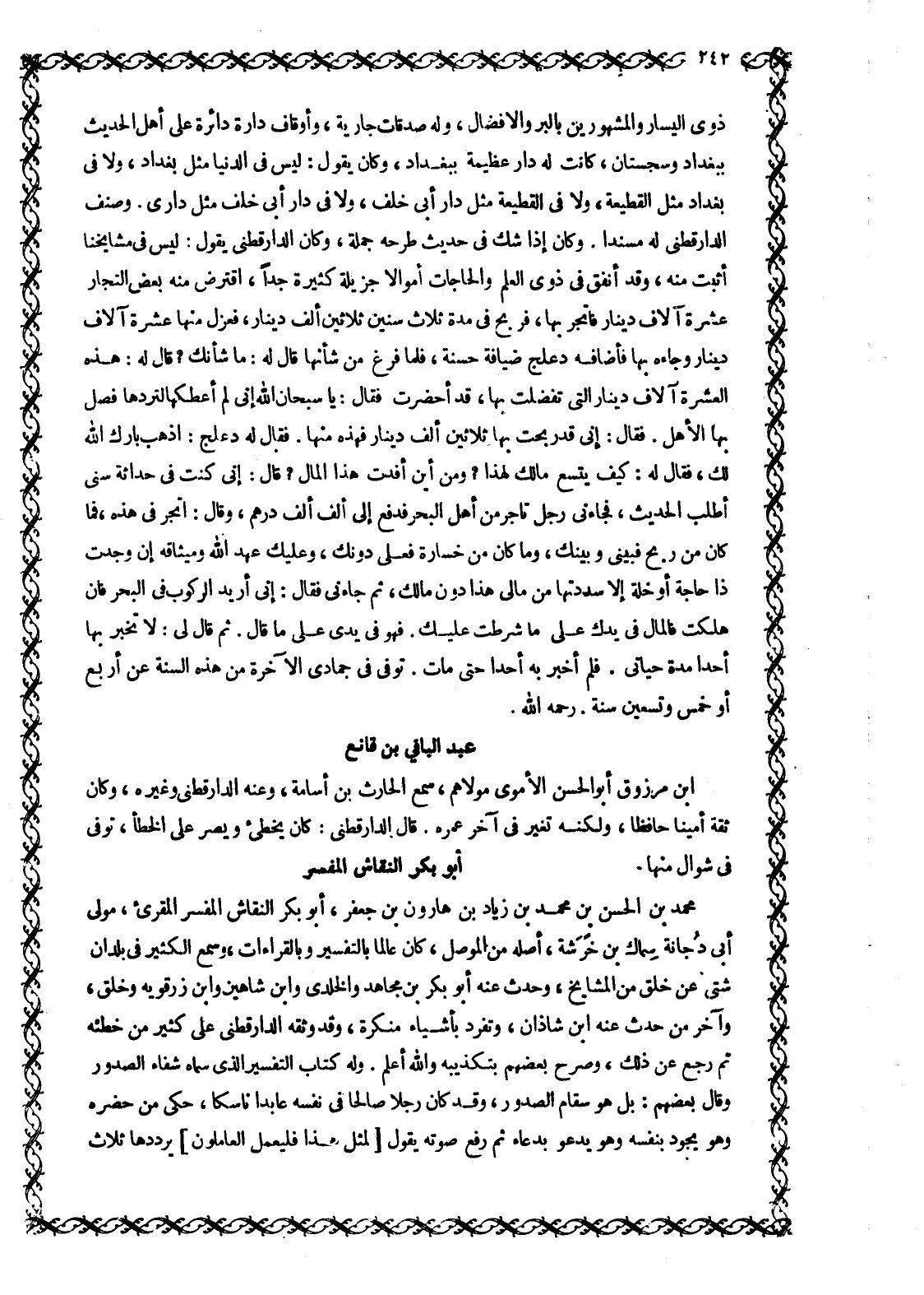 ذَوِي الْيَسَارِ وَالْمَشْهُورِينَ بِالْبِرِّ وَالْإِفْضَالِ، وَلَهُ صَدَقَاتٌ جارية، وأوقاف دارة دائرة على أهل الحديث ببغداد وسجستان، كانت له دار عظيمة ببغداد، وكان يقول: لَيْسَ فِي الدُّنْيَا مِثْلُ بَغْدَادَ، وَلَا فِي بَغْدَادَ مِثْلُ الْقَطِيعَةِ، وَلَا فِي الْقَطِيعَةِ مِثْلُ دار أبى خلف، ولا في دار أبى خلف مثل داري. وصنف الدار قطنى لَهُ مُسْنَدًا. وَكَانَ إِذَا شَكَّ فِي حَدِيثٍ طرحه جملة، وكان الدار قطنى يقول: ليس فِي مَشَايِخِنَا أَثْبَتَ مِنْهُ، وَقَدْ أَنْفَقَ فِي ذوى العلم والحاجات أَمْوَالًا جَزِيلَةً كَثِيرَةً جِدًّا، اقْتَرَضَ مِنْهُ بَعْضُ التجار عشرة آلاف دينار فاتجر بها، فَرَبَحَ فِي مُدَّةِ ثَلَاثِ سِنِينَ ثَلَاثِينَ أَلْفَ دِينَارٍ، فَعَزَلَ مِنْهَا عَشْرَةَ آلَافِ دِينَارٍ وَجَاءَهُ بِهَا فَأَضَافَهُ دَعْلَجُ ضِيَافَةً حَسَنَةً، فَلَمَّا فَرَغَ من شأنها قال له: ما شأنك؟ قال له: هذه العشرة آلاف دينار التي تفضلت بها، قد أحضرت فَقَالَ: يَا سُبْحَانَ اللَّهِ إِنِّي لَمْ أُعْطِكَهَا لتردها فصل بها الأهل. فقال إني قد ربحت بها ثَلَاثِينَ أَلْفَ دِينَارٍ فَهَذِهِ مِنْهَا. فَقَالَ لَهُ دعلج: اذهب بَارَكَ اللَّهُ لَكَ، فَقَالَ لَهُ: كَيْفَ يَتَّسِعُ مَالُكَ لِهَذَا؟ وَمِنْ أَيْنَ أَفَدْتَ هَذَا الْمَالَ؟ قال: إِنِّي كُنْتُ فِي حَدَاثَةِ سِنِّي أَطْلُبُ الْحَدِيثَ، فَجَاءَنِي رِجُلٌ تَاجِرٌ مِنْ أَهْلِ الْبَحْرِ فَدَفَعَ إِلَيَّ أَلْفَ أَلْفِ دِرْهَمٍ، وَقَالَ: اتَّجِرْ فِي هَذِهِ، فَمَا كَانَ مِنْ رِبْحٍ فَبَيْنِي وَبَيْنَكَ، وَمَا كَانَ مِنْ خَسَارَةٍ فَعَلَيَّ دُونَكَ، وَعَلَيْكَ عهد الله وميثاقه إن وجدت ذا حاجة أو خلة الا سددتها من مالي هذا دون مالك، ثم جاءني فقال: إني أريد الركوب فِي الْبَحْرِ فَإِنْ هَلَكْتُ فَالْمَالُ فِي يَدِكَ عَلَى مَا شَرَطْتُ عَلَيْكَ. فَهُوَ فِي يَدِي عَلَى مَا قَالَ. ثُمَّ قَالَ لِي: لَا تخبر بها أَحَدًا مُدَّةَ حَيَاتِي. فَلَمْ أُخْبِرْ بِهِ أَحَدًا حتى مات. تُوُفِّيَ فِي جُمَادَى الْآخِرَةِ مِنْ هَذِهِ السَّنَةِ عَنْ أَرْبَعٍ أَوْ خَمْسٍ وَتِسْعِينَ سَنَةً. رَحِمَهُ الله.