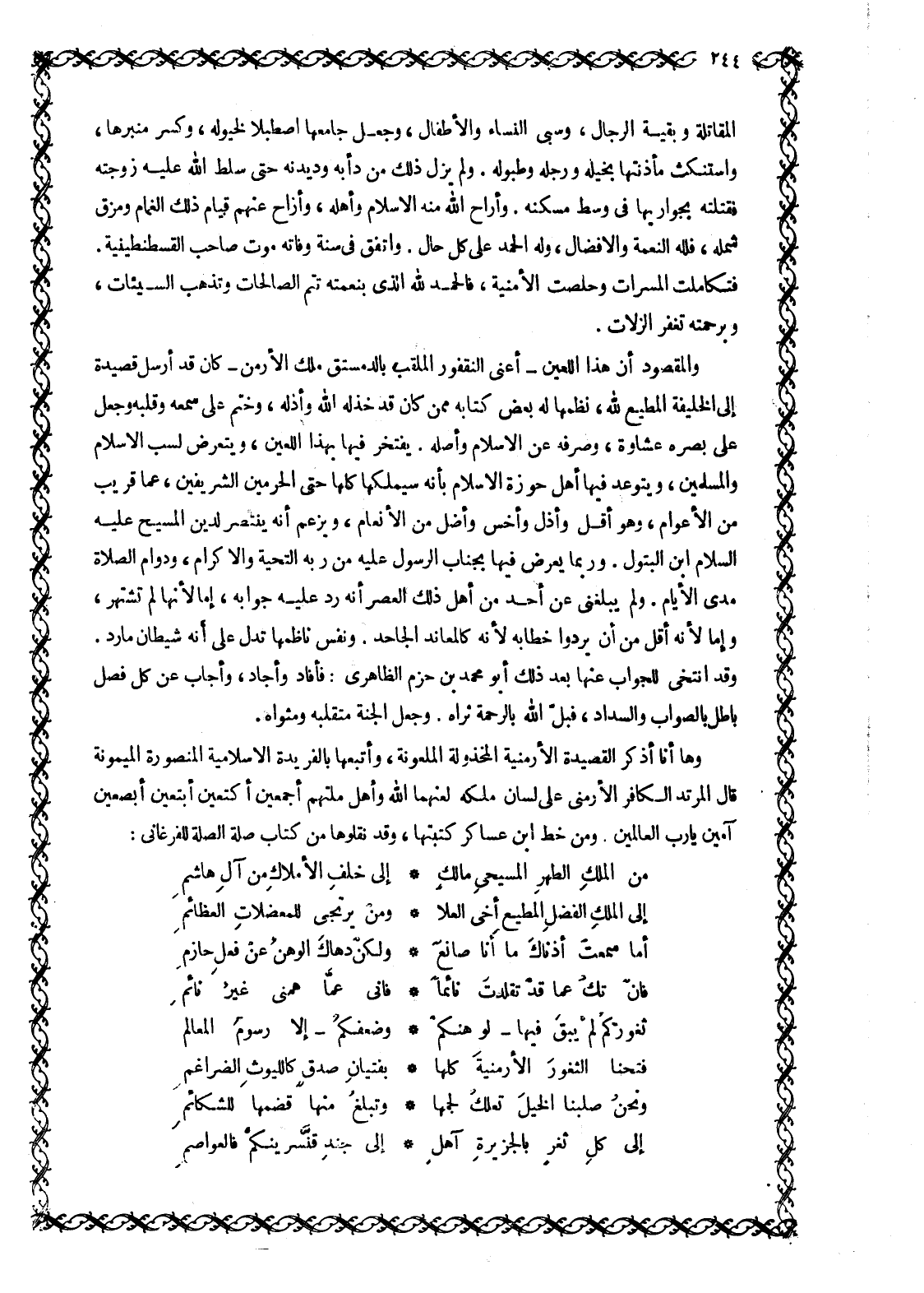 وَهَا أَنَا أَذْكُرُ الْقَصِيدَةَ الْأَرْمَنِيَّةَ الْمَخْذُولَةَ الْمَلْعُونَةَ، وَأُتْبِعُهَا بِالْفَرِيدَةِ الْإِسْلَامِيَّةِ الْمَنْصُورَةِ الْمَيْمُونَةِ قَالَ الْمُرْتَدُّ الْكَافِرُ الْأَرْمَنِيُّ عَلَى لِسَانِ مَلِكِهِ لَعَنَهُمَا اللَّهُ وَأَهْلَ مِلَّتِهِمْ أَجْمَعِينَ أَكْتَعِينَ أَبْتَعِينَ أَبْصَعِينَ آمِينَ يَا رَبَّ الْعَالَمِينَ. وَمِنْ خَطِّ ابْنِ عَسَاكِرَ كَتَبْتُهَا، وَقَدْ نَقَلُوهَا مِنْ كِتَابِ صِلَةِ الصِّلَةِ لِلْفَرْغَانِيِّ: