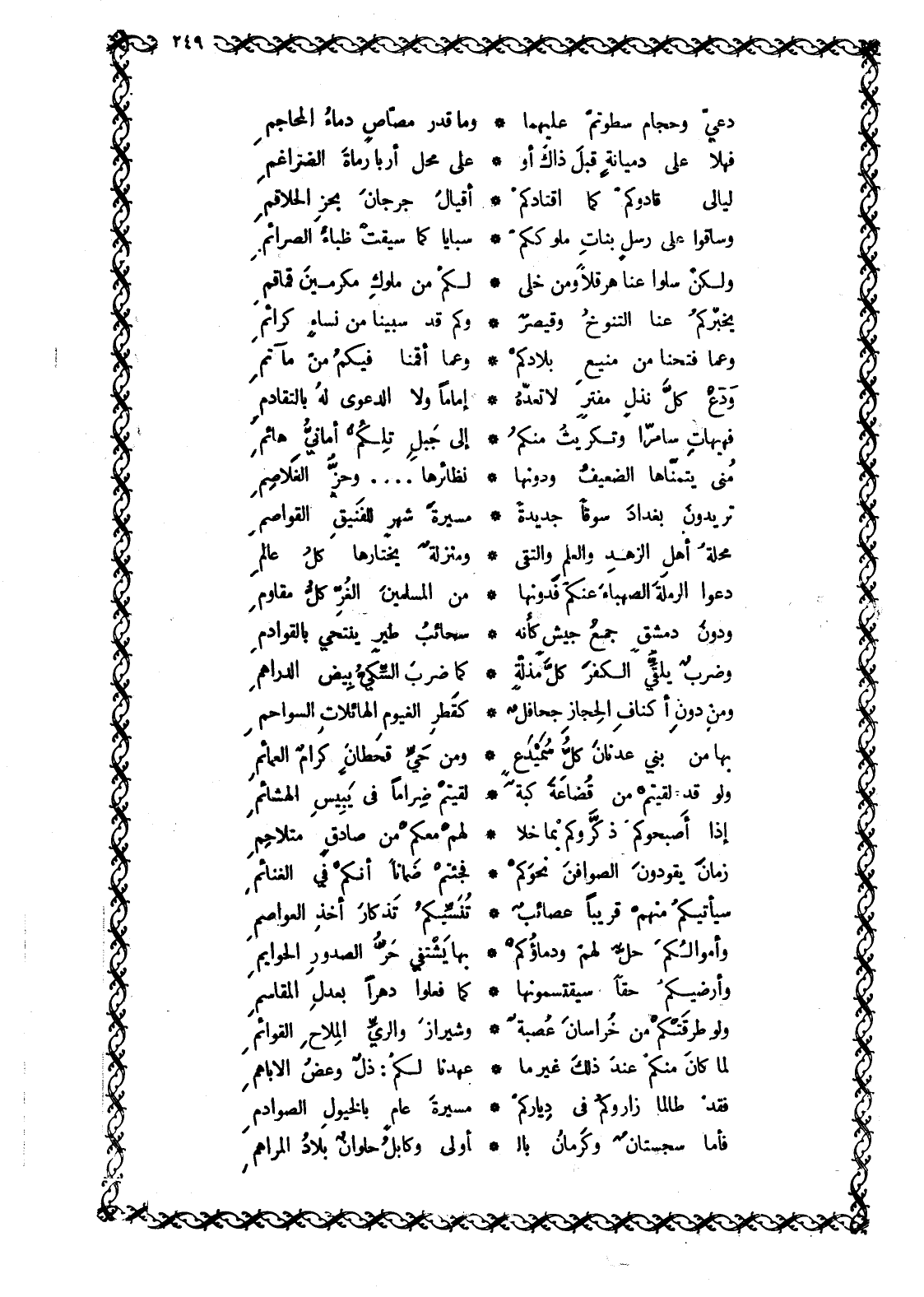 وَلَوْ طَرَقَتْكُمُ مِنْ خُرَاسَانَ عُصْبَةٌ ... وَشِيرَازَ وَالرَّيِّ الملاح الْقَوَائِمِ