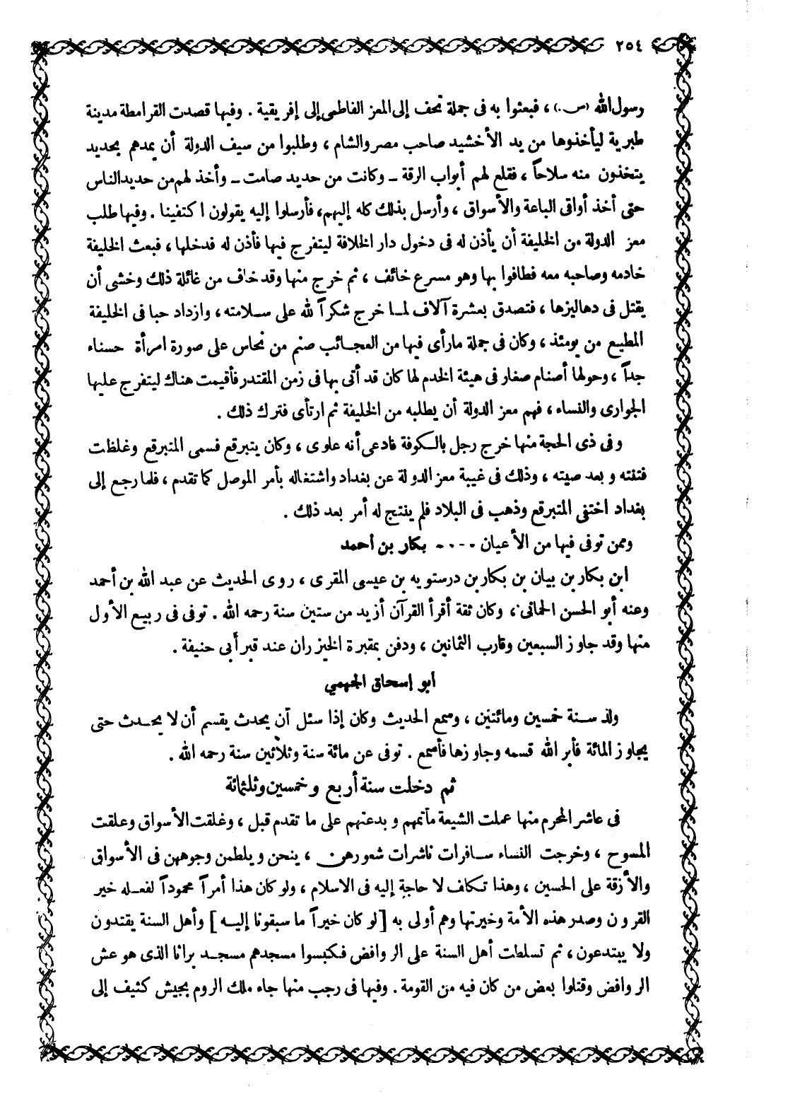 رسول الله صلى الله عليه وسلم، فبعثوا به فِي جُمْلَةِ تُحَفٍ إِلَى الْمُعِزِّ الْفَاطِمِيِّ إِلَى إِفْرِيقِيَّةَ. وَفِيهَا قَصَدَتِ الْقَرَامِطَةُ مَدِينَةَ طَبَرِيَّةَ لِيَأْخُذُوهَا من يد الإخشيد صاحب مضر وَالشَّامِ، وَطَلَبُوا مِنْ سَيْفِ الدَّوْلَةِ أَنْ يَمُدَّهُمْ بِحَدِيدٍ يَتَّخِذُونَ مِنْهُ سِلَاحًا، فَقَلَعَ لَهُمْ أَبْوَابَ الرقة- وكانت من حديد صامت- وأخذ لهم من حديد الناس حتى أخذ أواقي الباعة والأسواق، وأرسل بذلك كله إليهم، فأرسلوا إليه يقولون اكْتَفَيْنَا. وَفِيهَا طَلَبَ مُعِزُّ الدَّوْلَةِ مِنَ الْخَلِيفَةِ أَنْ يَأْذَنَ لَهُ فِي دُخُولِ دَارِ الْخِلَافَةِ ليتفرج فيها فأذن له فدخلها، فبعث الخليفة خادمه وصاحبه معه فطافوا بها وهو مسرع خائف، ثم خرج منها وَقَدْ خَافَ مِنْ غَائِلَةِ ذَلِكَ وَخَشِيَ أَنْ يقتل في دهاليزها، فَتَصَدَّقَ بِعَشَرَةِ آلَافٍ لَمَّا خَرَجَ شُكْرًا للَّه عَلَى سَلَامَتِهِ، وَازْدَادَ حُبًّا فِي الْخَلِيفَةِ الْمُطِيعِ من يومئذ، وكان في جملة ما رأى فيها من العجائب صَنَمٌ مِنْ نُحَاسٍ عَلَى صُورَةِ امْرَأَةٍ حَسْنَاءَ جِدًّا، وَحَوْلَهَا أَصْنَامٌ صِغَارٌ فِي هَيْئَةِ الْخَدَمِ لها كان قد أتى بها في زمن المقتدر فأقيمت هناك ليتفرج عليها الجواري والنساء، فهم معز الدولة أَنْ يَطْلُبَهُ مِنَ الْخَلِيفَةِ ثُمَّ ارْتَأَى فَتَرَكَ ذَلِكَ.