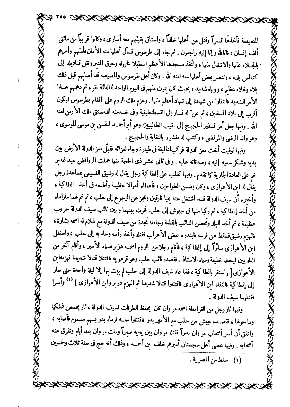 المصيصة فأخذها قَسْرًا وَقَتَلَ مِنْ أَهْلِهَا خَلْقًا، وَاسْتَاقَ بَقِيَّتَهُمْ مَعَهُ أُسَارَى، وَكَانُوا قَرِيبًا مِنْ مِائَتَيْ أَلْفِ إنسان، ف إِنَّا لِلَّهِ وَإِنَّا إِلَيْهِ راجِعُونَ 2: 156. ثم جاء إِلَى طَرَسُوسَ فَسَأَلَ أَهْلُهَا مِنْهُ الْأَمَانَ فَأَمَّنَهُمْ وأمرهم بالجلاء عنها والانتقال منها، واتخذ مسجدها الأعظم إِسْطَبْلًا لِخُيُولِهِ وَحَرَّقَ الْمِنْبَرَ وَنَقَلَ قَنَادِيلَهُ إِلَى كَنَائِسِ بَلَدِهِ، وَتَنَصَّرَ بَعْضُ أَهْلِهَا مَعَهُ لَعَنَهُ اللَّهُ. وَكَانَ أَهْلُ طَرَسُوسَ وَالْمِصِّيصَةِ قَدْ أَصَابَهُمْ قبل ذلك بلاء وغلاء عَظِيمٌ، وَوَبَاءٌ شَدِيدٌ، بِحَيْثُ كَانَ يَمُوتُ مِنْهُمْ في اليوم الواحد ثمانمائة نَفَرٍ، ثُمَّ دَهَمَهُمْ هَذَا الْأَمْرُ الشَّدِيدُ فَانْتَقَلُوا من شهادة إلى شهاد أَعْظَمَ مِنْهَا. وَعَزَمَ مَلِكُ الرُّومِ عَلَى الْمُقَامِ بِطَرَسُوسَ لِيَكُونَ أَقْرَبَ إِلَى بِلَادِ الْمُسْلِمِينَ، ثُمَّ عَنَّ لَهُ فَسَارَ إِلَى الْقُسْطَنْطِينِيَّةِ وَفِي خِدْمَتِهِ الدمستق ملك الأرمن لعنه اللَّهُ. وَفِيهَا جُعِلَ أَمْرُ تَسْفِيرِ الْحَجِيجِ إِلَى نقيب الطالبيين وهو أبو أحمد الحسن بْنُ مُوسَى الْمُوسَوِيُّ، وَهُوَ وَالِدُ الرَّضِيِّ وَالْمُرْتَضَى، وكتب له منشور بالنقابة والحجيج.