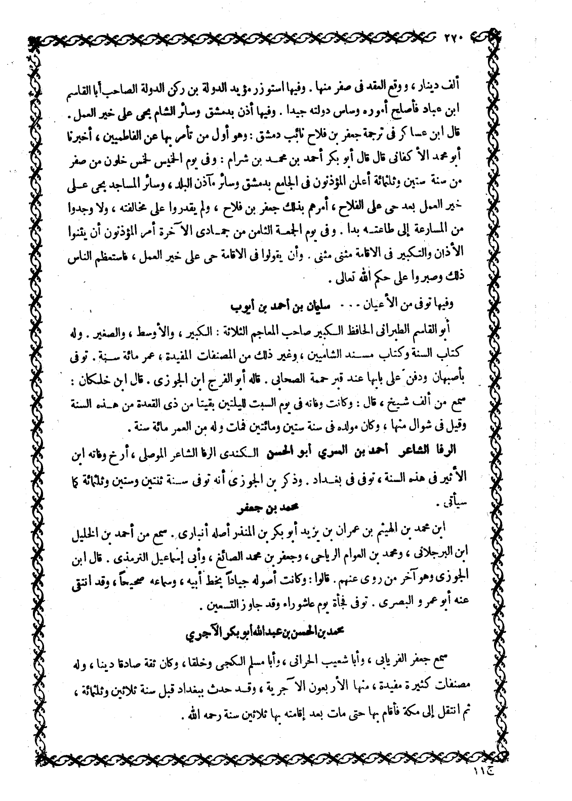 أَبُو الْقَاسِمِ الطبراني الحافظ الكبير صاحب المعاجم الثلاثة: الكبير، والأوسط، والصغير. وله كتاب السُّنَّةِ وَكِتَابِ مُسْنَدِ الشَّامِيِّينَ، وَغَيْرِ ذَلِكَ مِنَ المصنفات المفيدة، عمر مائة سنة. توفى بِأَصْبَهَانَ وَدُفِنَ عَلَى بَابِهَا عِنْدَ قَبْرِ حُمَمَةَ الصحابي. قاله أبو الفرج ابن الجوزي. قال ابن خلكان: