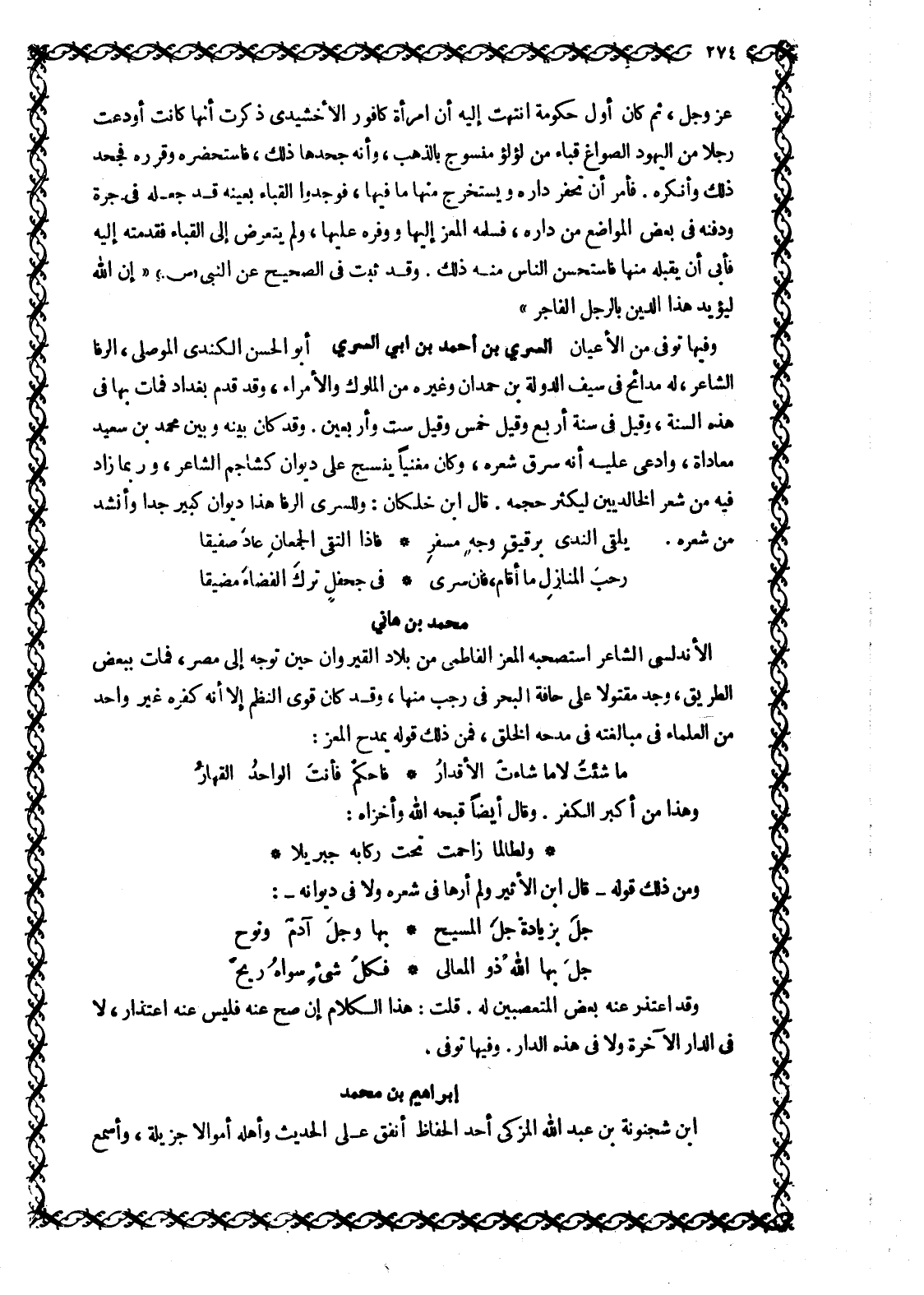الأندلسى الشاعر استصحبه المعز الفاطمي من بلاد القيروان حين توجه إلى مصر، فمات ببعض الطريق، وجد مقتولا على حافة البحر في رجب منها، وقد كان قَوِيَّ النَّظْمِ إِلَّا أَنَّهُ كَفَّرَهُ غَيْرُ وَاحِدٍ من العلماء في مبالغته في مدحه الخلق، فمن ذلك قوله يمدح المعز: