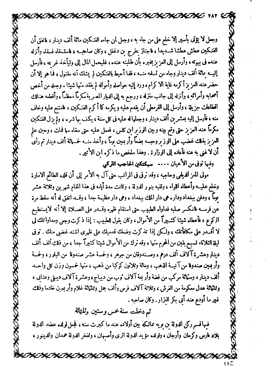 مَوْلَى الْمُعِزِّ الدَّيْلَمِيِّ وَحَاجِبُهُ، وَقَدْ تَرَقَّى فِي الْمَرَاتِبِ حَتَّى آل به الأمر إِلَى أَنْ قَلَّدَهُ الطَّائِعُ الْإِمَارَةَ وَخَلَعَ عَلَيْهِ وَأَعْطَاهُ اللِّوَاءَ، وَلَقَّبَهُ بِنُورِ الدَّوْلَةِ، وَكَانَتْ مُدَّةُ أيامه فِي هَذَا الْمَقَامِ شَهْرَيْنِ وَثَلَاثَةَ عَشَرَ يَوْمًا، وَدُفِنَ بِبَغْدَادَ وَدَارُهُ هِيَ دَارُ الْمُلْكِ بِبَغْدَادَ، وَهِيَ دَارٌ عَظِيمَةٌ جِدًّا، وَقَدِ اتَّفَقَ لَهُ أنه سقط مرة عن فرسه فانكسر صلبه فَدَاوَاهُ الطَّبِيبُ حَتَّى اسْتَقَامَ ظَهْرُهُ وَقَدَرَ عَلَى الصلاة إلا أنه لا يستطيع الرُّكُوعَ، فَأَعْطَاهُ شَيْئًا كَثِيرًا مِنَ الْأَمْوَالِ، وَكَانَ يقول للطبيب: إذا ذكرت وجعي وَمُدَاوَاتَكَ لِي لَا أَقْدِرُ عَلَى مُكَافَأَتِكَ، وَلَكِنْ إِذَا تَذَكَّرْتُ وَضْعَكَ قَدَمَيْكَ عَلَى ظَهْرِي اشْتَدَّ غضبى منك. توفى ليلة الثلاثاء لسبع بقين من المحرم منها، وَقَدْ تَرَكَ مِنَ الْأَمْوَالِ شَيْئًا كَثِيرًا جِدًّا، مِنْ ذَلِكَ أَلْفُ أَلْفِ دِينَارٍ وَعَشَرَةُ آلَافِ أَلْفِ دِرْهَمٍ، وَصُنْدُوقَانِ مِنْ جَوْهَرٍ، وَخَمْسَةَ عَشَرَ صندوقا من البلور، وخمسة وأربعين صندوقا من آنية الذهب، ومائة وثلاثون كوكبا مِنْ ذَهَبٍ، مِنْهَا خَمْسُونَ وَزْنُ كُلِّ وَاحِدٍ ألف دينار، وستمائة مركب من فضة وأربعة آلاف ثوب من ديباج، وعشرة آلاف ديبقي وَعِتَّابِيٍّ، وَثَلَاثُمِائَةِ عِدْلٍ مَعْكُومَةٍ مِنَ الْفُرُشِ، وَثَلَاثَةُ آلاف فرس وَأَلْفُ جَمَلٍ وَثَلَاثُمِائَةِ غُلَامٍ وَأَرْبَعُونَ خَادِمًا وَذَلِكَ غَيْرُ مَا أَوْدَعَ عِنْدَ أَبِي بَكْرٍ الْبَزَّارِ. وكان صاحبه.