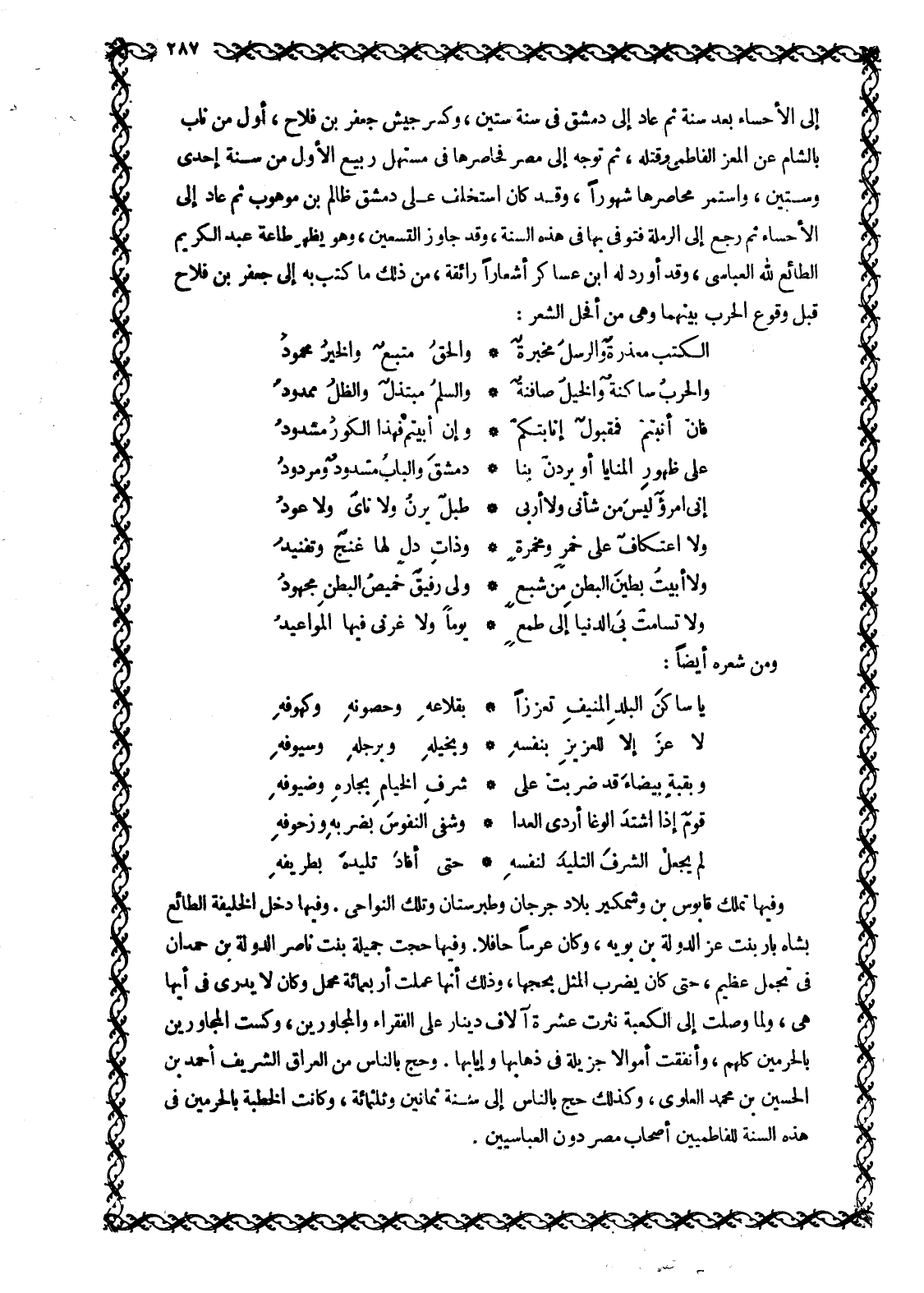 إِلَى الْأَحْسَاءِ بَعْدَ سَنَةٍ ثُمَّ عَادَ إِلَى دِمَشْقَ فِي سَنَةِ سِتِّينَ، وَكَسَرَ جَيْشَ جَعْفَرِ بْنِ فَلَاحٍ، أَوَّلِ مَنْ نَابَ بِالشَّامِ عَنِ المعز الفاطمي قتله، ثُمَّ تَوَجَّهَ إِلَى مِصْرَ فَحَاصَرَهَا فِي مُسْتَهَلِّ رَبِيعٍ الْأَوَّلِ مِنْ سَنَةِ إِحْدَى وَسِتِّينَ، وَاسْتَمَرَّ مُحَاصِرُهَا شُهُورًا، وَقَدْ كَانَ اسْتَخْلَفَ عَلَى دِمَشْقَ ظالم بن موهوب ثُمَّ عَادَ إِلَى الْأَحْسَاءِ ثُمَّ رَجَعَ إِلَى الرَّمْلَةِ فَتُوفِّيَ بِهَا فِي هَذِهِ السَّنَةِ، وَقَدْ جاوز التِّسْعِينَ، وَهُوَ يُظْهِرُ طَاعَةَ عَبْدِ الْكَرِيمِ الطَّائِعِ للَّه العباسي، وقد أورد له ابن عساكر أشعارا رائقة، مِنْ ذَلِكَ مَا كَتَبَ بِهِ إِلَى جَعْفَرِ بن فلاح قبل وقوع الحرب بينهما وهي من أفحل الشعر:
