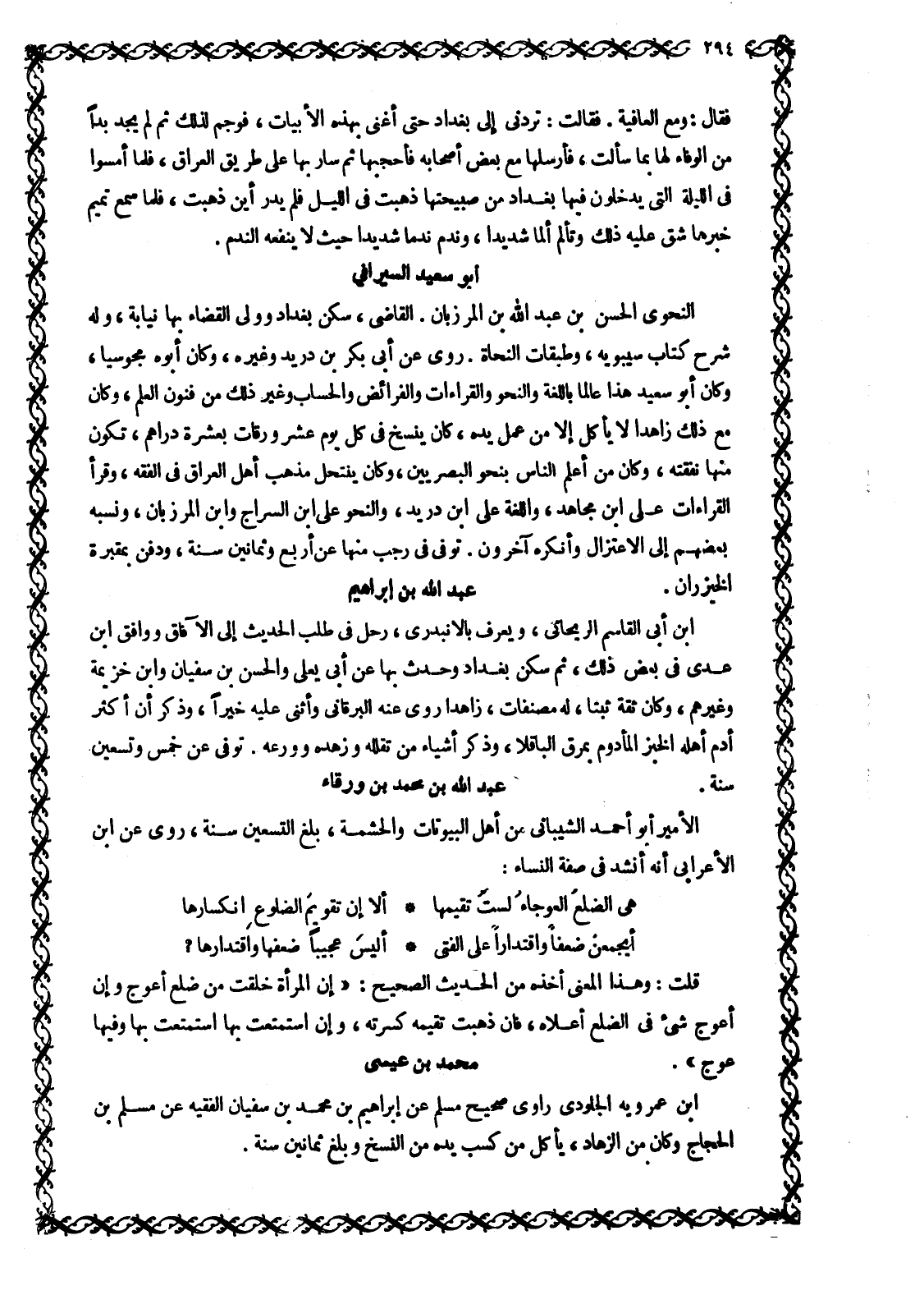 النَّحْوِيُّ الْحَسَنُ بْنُ عَبْدِ الله بن المرزبان. الْقَاضِي، سَكَنَ بَغْدَادَ وَوَلِيَ الْقَضَاءَ بِهَا نِيَابَةً، وله شرح كتاب سيبويه، وطبقات النحاة. روى عَنْ أَبِي بَكْرِ بْنِ دُرَيْدٍ وَغَيْرِهِ، وَكَانَ أبوه مجوسيا، وكان أبو سعيد هذا عالما باللغة والنحو والقراءات وَالْفَرَائِضِ وَالْحِسَابِ وَغَيْرِ ذَلِكَ مِنْ فُنُونِ الْعِلْمِ، وكان مع ذلك زَاهِدًا لَا يَأْكُلُ إِلَّا مِنْ عَمَلِ يَدِهِ، كَانَ يَنْسَخُ فِي كُلِّ يَوْمٍ عَشْرَ وَرَقَاتٍ بعشرة دراهم، تكون منها نفقته، وكان من أعلم الناس بنحو البصريين، وكان ينتحل مذهب أهل العراق في الفقه، وقرأ القراءات عَلَى ابْنِ مُجَاهِدٍ، وَاللُّغَةَ عَلَى ابْنِ دُرَيْدٍ، والنحو على ابن السراج وابن المرزبان، ونسبه بعضهم إلى الاعتزال وأنكره آخرون. توفى في رجب منها عَنْ أَرْبَعٍ وَثَمَانِينَ سَنَةً، وَدُفِنَ بِمَقْبَرَةِ الْخَيْزُرَانِ.