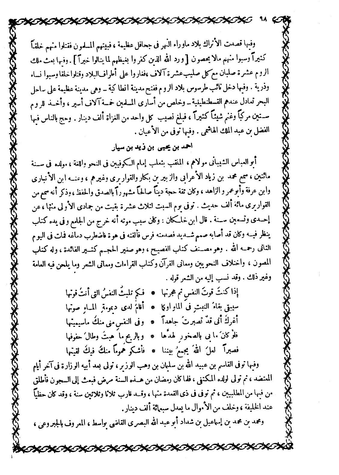 أَبُو الْعَبَّاسِ الشَّيْبَانِيُّ مَوْلَاهُمُ، الْمُلَقَّبُ بِثَعْلَبٍ إِمَامُ الْكُوفِيِّينَ فِي النَّحْوِ وَاللُّغَةِ، مَوْلِدُهُ في سنة مائتين، سمع محمد بن زياد الْأَعْرَابِيِّ وَالزُّبَيْرَ بْنَ بَكَّارٍ وَالْقَوَارِيرِيَّ وَغَيْرَهُمْ، وَعَنْهُ ابن الأنباري وابن عرفة وأبو عمر والزاهد، وَكَانَ ثِقَةً حُجَّةً دَيِّنًا صَالِحًا مَشْهُورًا بِالصِّدْقِ وَالْحِفْظِ، وَذُكِرَ أَنَّهُ سَمِعَ مِنَ الْقَوَارِيرِيِّ مِائَةَ ألف حديث. توفى يَوْمَ السَّبْتِ لِثَلَاثَ عَشْرَةَ بَقِيَتْ مِنْ جُمَادَى الأولى منها، عَنْ إِحْدَى وَتِسْعِينَ سَنَةً. قَالَ ابْنُ خَلِّكَانَ: وَكَانَ سَبَبَ مَوْتِهِ أَنَّهُ خَرَجَ مِنَ الْجَامِعِ وَفِي يَدِهِ كِتَابٌ يَنْظُرُ فِيهِ وَكَانَ قَدْ أَصَابَهُ صَمَمٌ شَدِيدٌ فَصَدَمَتْهُ فَرَسٌ فَأَلْقَتْهُ فِي هُوَّةٍ فَاضْطَرَبَ دِمَاغُهُ فَمَاتَ فِي الْيَوْمِ الثَّانِي رحمه الله وَهُوَ مُصَنِّفُ كِتَابِ الْفَصِيحِ، وَهُوَ صَغِيرُ الْحَجْمِ كثير الفائدة، وله كتاب المصون، واختلاف النحويين ومعاني القرآن وكتاب القراءات ومعاني الشعر وما يلحن فيه العامة وغير ذلك. وقد نسب إليه من الشعر قوله.