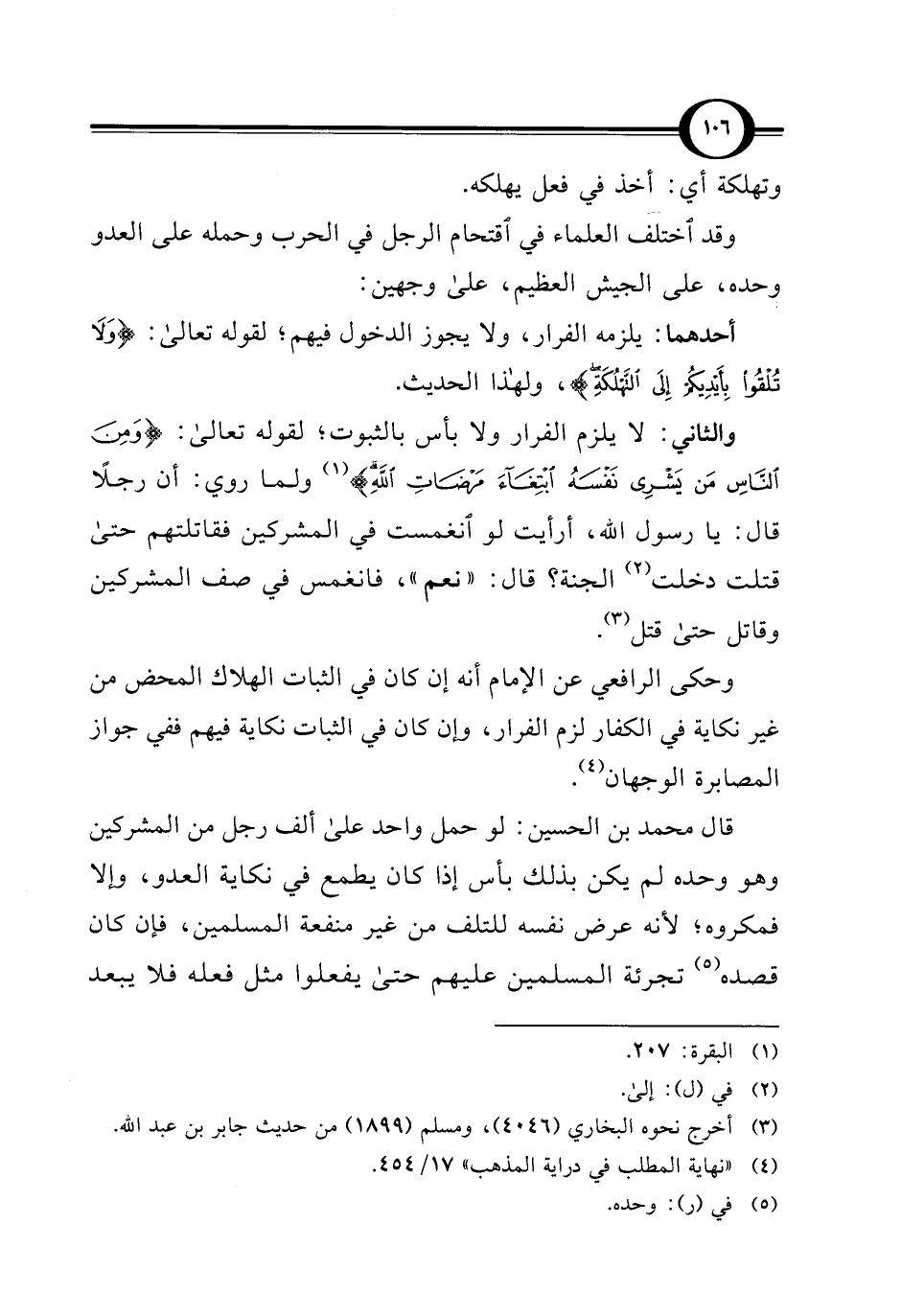 وقد اختلف العلماء في اقتحام الرجل في الحرب وحمله على العدو وحده، على الجيش العظيم، على وجهين: