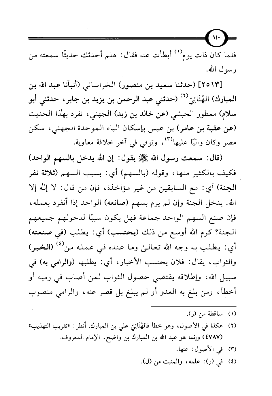 [2513] (حدثنا سعيد بن منصور) الخراساني (أنبأنا عبد الله بن المبارك) الهُنَائِيّ (¬2) (حدثني عبد الرحمن بن يزيد بن جابر، حدثني أبو سلام) ممطور الحبشي (عن خالد بن زيد) الجهني، تفرد بهذا الحديث (عن عقبة بن عامر) بن عبس بإسكان الباء الموحدة الجهني، سكن مصر وكان واليًا عليها (¬3)، وتوفي في آخر خلافة معاوية.