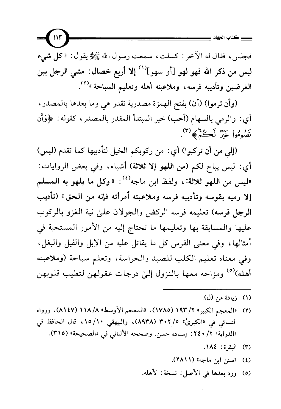 (إلى من أن تركبوا) أي: من ركوبكم الخيل لتأديبها كما تقدم (ليس) أي: ليس يباح لكم (من اللهو إلا ثلاثة) أشياء، وفي بعض الروايات: "ليس من اللهو ثلاثة"، ولفظ ابن ماجه (¬4): "وكل ما يلهو به المسلم إلا رميه بقوسه وتأديبه فرسه وملاعبته امرأته فإنه من الحق" (تأديب الرجل فرسه) تعليمه فرسه الركض والجولان على نية الغزو بالركوب عليها والمسابقة بها وتعليمها ما تحتاج إليه من الأمور المستحبة في أمثالها، وفي معنى الفرس كل ما يقاتل عليه من الإبل والفيل والبغل، وفي معناه تعليم الكلب للصيد والحراسة، وتعلم سباحة (وملاعبته أهله) (¬5) ومزاحه معها بالنزول إلى درجات عقولهن لتطيب قلوبهن