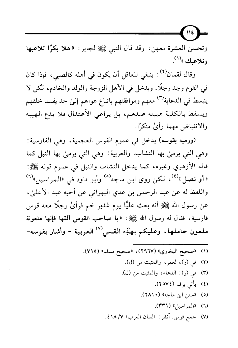 (ورميه بقوسه) يدخل في عموم القوس العجمية، وهي الفارسية: وهي التي يرمى بها النشاب. والعربية: وهي التي يرمى بها النبل كما قاله الأزهري وغيره، كما يدخل النشاب والنبل في عموم قوله - صلى الله عليه وسلم -: " أو نصل " (¬4)، لكن روى ابن ماجه (¬5) وأبو داود في "المراسيل" (¬6) واللفظ له عن عبد الرحمن بن عدي البهراني عن أخيه عبد الأعلى، عن رسول الله - صلى الله عليه وسلم - أنه بعث عليًّا يوم غدير خم فرأى رجلًا معه قوس فارسية، فقال له رسول الله - صلى الله عليه وسلم -: "يا صاحب القوس ألقها فإنها ملعونة ملعون حاملها، وعليكم بهذِه القسي (¬7) العربية -وأشار بقوسه-