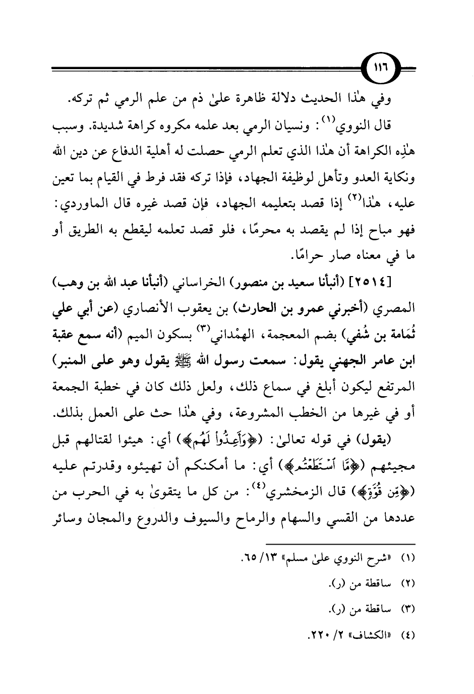 [2514] (أنبأنا سعيد بن منصور) الخراساني (أنبأنا عبد الله بن وهب) المصري (أخبرني عمرو بن الحارث) بن يعقوب الأنصاري (عن أبي علي ثُمَامة بن شُفي) بضم المعجمة، الهمْداني (¬3) بسكون الميم (أنه سمع عقبة ابن عامر الجهني يقول: سمعت رسول الله - صلى الله عليه وسلم - يقول وهو على المنبر) المرتفع ليكون أبلغ في سماع ذلك، ولعل ذلك كان في خطبة الجمعة أو في غيرها من الخطب المشروعة، وفي هذا حث على العمل بذلك.