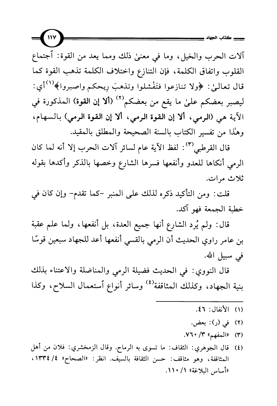 آلات الحرب والخيل، وما في معنى ذلك ومما يعد من القوة: اجتماع القلوب واتفاق الكلمة، فإن التنازع واختلاف الكلمة تذهب القوة كما قال تعالى: {وَلَا تَنَازَعُوا فَتَفْشَلُوا وَتَذْهَبَ رِيحُكُمْ وَاصْبِرُوا} (¬1) أي: ليصبر بعضكم على ما يقع من بعضكم (¬2) (ألا إن القوة) المذكورة في الآية هي (الرمي، ألا إن القوة الرمي، ألا إن القوة الرمي) بالسهام، وهذا من تفسير الكتاب بالسنة الصحيحة والمطلق بالمقيد.