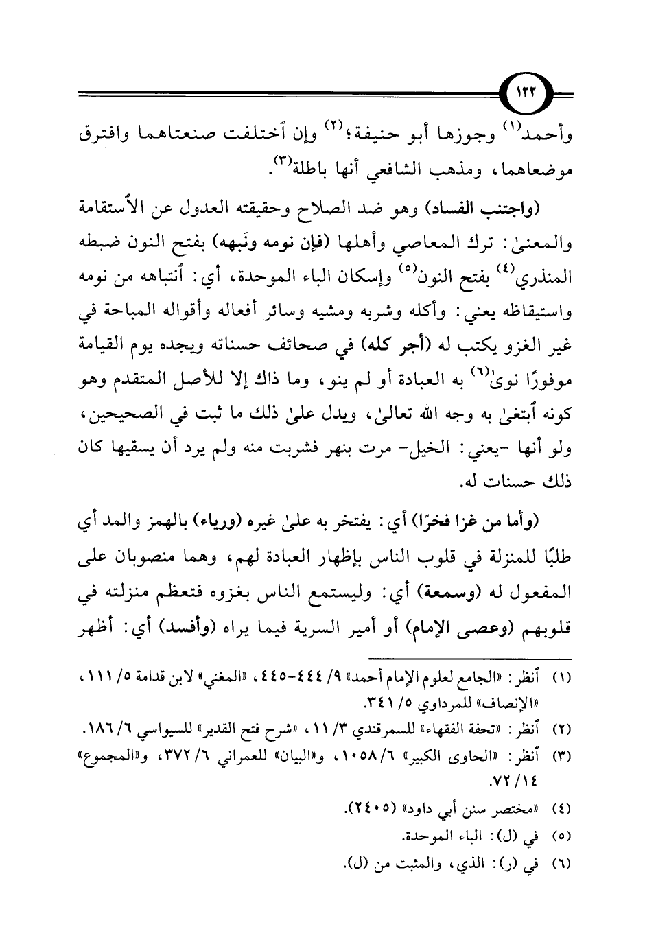 (واجتنب الفساد) وهو ضد الصلاح وحقيقته العدول عن الاستقامة والمعنى: ترك المعاصي وأهلها (فإن نومه ونَبهه) بفتح النون ضبطه المنذري (¬4) بفتح النون (¬5) وإسكان الباء الموحدة، أي: انتباهه من نومه واستيقاظه يعني: وأكله وشربه ومشيه وسائر أفعاله وأقواله المباحة في غير الغزو يكتب له (أجر كله) في صحائف حسناته ويجده يوم القيامة موفورًا نوى (¬6) به العبادة أو لم ينو، وما ذاك إلا للأصل المتقدم وهو كونه ابتغى به وجه الله تعالى، ويدل على ذلك ما ثبت في الصحيحين، ولو أنها -يعني: الخيل- مرت بنهر فشربت منه ولم يرد أن يسقيها كان ذلك حسنات له.