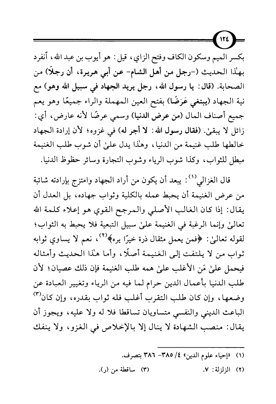 قال الغزالي (¬1): يبعد أن يكون من أراد الجهاد وامتزج بإرادته شائبة من عرض الغنيمة أن يحبط عمله بالكلية وثواب جهاده، بل العدل أن يقال: إذا كان الغالب الأصلي والمرجح القوي هو إعلاء كلمة الله تعالى وإنما الرغبة في الغنيمة على سبيل التبعية فلا يحبط به الثواب؛ لقوله تعالى: {فَمَنْ يَعْمَلْ مِثْقَالَ ذَرَّةٍ خَيْرًا يَرَهُ} (¬2)، نعم لا يساوي ثوابه ثواب من لا يلتفت إلى الغنيمة أصلًا، وأما هذا الحديث وأمثاله فيحمل على مَن الأغلب على همه طلب الغنيمة فإن ذلك عصيان؛ لأن طلب الدنيا بأعمال الدين حرام لما فيه من الرياء وتغيير العبادة عن وضعها، وإن كان طلب التقرب أغلب فله ثواب بقدره، وإن كان (¬3) الباعث الديني والنفسي متساويان تساقطا فلا له ولا عليه، ويجوز أن يقال: منصب الشهادة لا ينال إلا بالإخلاص في الغزو، ولا ينفك