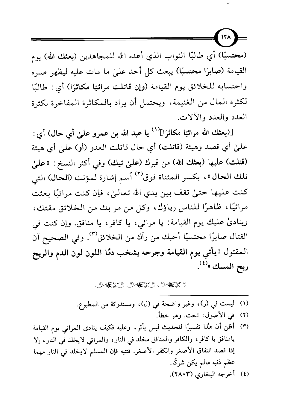 [(بعثك الله مرائيًا مكاثرًا] (¬1) يا عبد الله بن عمرو على أي حال) أي: على أي قصد وهيئة (قاتلت) أي حال قاتلت العدو (أو) على أي هيئة (قتلت) عليها (بعثك الله) من قبرك (على تيك) وفي أكثر النسخ: "على تلك الحال"، بكسر المثناة فوق (¬2) اسم إشارة لمؤنث (الحال) التي كنت عليها حتى تقف بين يدي الله تعالى، فإن كنت مرائيًا بعثت مرائيًا، ظاهرًا للناس رياؤك، وكل من مر بك من الخلائق مقتك، وينادى عليك يوم القيامة: يا مرائي، يا كافر، يا منافق. وإن كنت في القتال صابرًا محتسبًا أحبك من رآك من الخلائق (¬3). وفي الصحيح أن المقتول " يأتي يوم القيامة وجرحه يشخب دمًا اللون لون الدم والريح ردح المسك " (¬4).