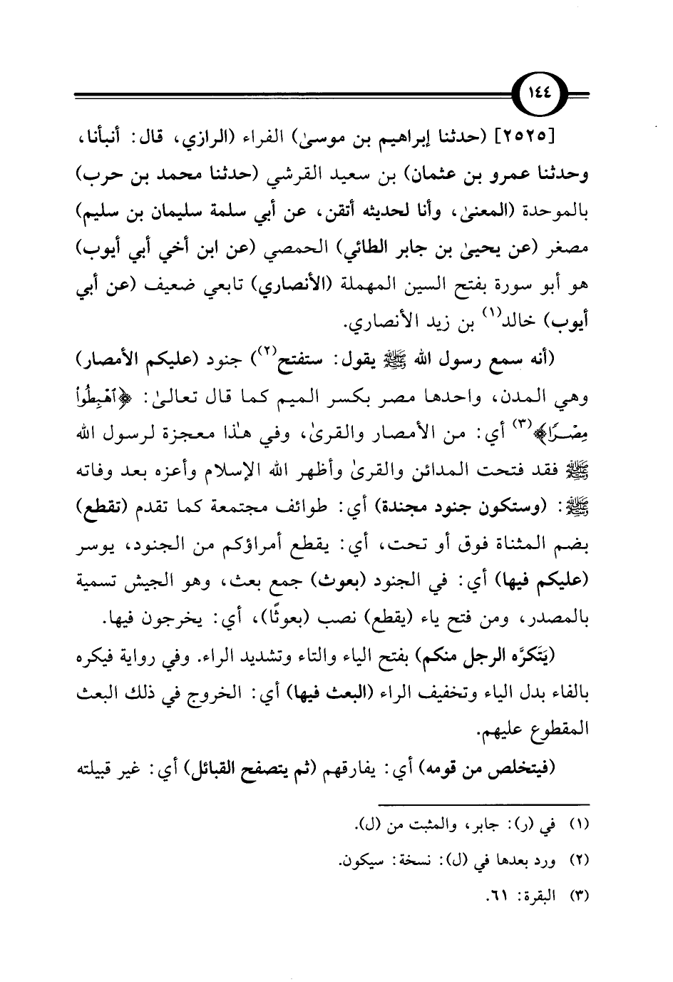 [2525] (حدثنا إبراهيم بن موسى) الفراء (الرازي، قال: أنبأنا، وحدثنا عمرو بن عثمان) بن سعيد القرشي (حدثنا محمد بن حرب) بالموحدة (المعنى، وأنا لحديثه أتقن، عن أبي سلمة سليمان بن سليم) مصغر (عن يحيى بن جابر الطائي) الحمصي (عن ابن أخي أبي أيوب) هو أبو سورة بفتح السين المهملة (الأنصاري) تابعي ضعيف (عن أبي أيوب) خالد (¬1) بن زيد الأنصاري.