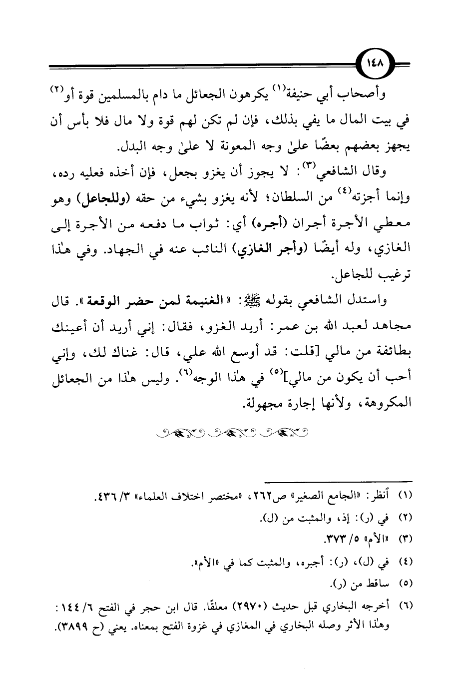 وقال الشافعي (¬3): لا يجوز أن يغزو بجعل، فإن أخذه فعليه رده، وإنما أجزته (¬4) من السلطان؛ لأنه يغزو بشيء من حقه (وللجاعل) وهو معطي الأجرة أجران (أجره) أي: ثواب ما دفعه من الأجرة إلى الغازي، وله أيضًا (وأجر الغازي) النائب عنه في الجهاد. وفي هذا ترغيب للجاعل.