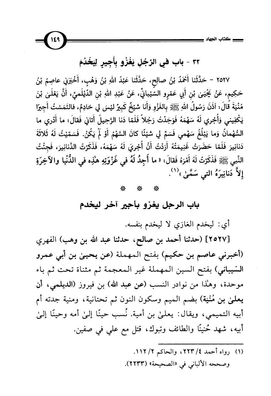 2527 - حَدَّثَنا أَحْمَدُ بْن صالِحٍ، حَدَّثَنا عَبْدُ اللهِ بْنُ وَهْبٍ، أَخْبَرَنِي عاصِمُ بْن حَكِيمٍ، عَنْ يَحْيَى بْنِ أَبِي عَمْرٍو السّيْبانيِّ، عَنْ عَبْدِ اللهِ بْنِ الدّيْلَميِّ، أَنَّ يَعْلَى بْنَ مُنْيَةَ قالَ: آذَنَ رَسُول اللهِ - صلى الله عليه وسلم - بِالغَزْوِ وَأَنا شيْخٌ كَبِيرٌ ليْسَ لي خادِمٌ، فالتَمَسْتُ أَجِيرًا يَكْفِيني وَأُجْري لَهُ سَهْمَهُ فَوَجَدْتُ رَجُلاً فَلَمّا دَنا الرَّحِيلُ أَتاني فَقالَ: ما أَدْري ما السُّهْمانُ وَما يَبْلُغُ سَهْمي فَسَمِّ لي شيْئًا كانَ السَّهْمُ أَوْ لَمْ يَكنْ. فَسَمّيْتُ لَهُ ثَلاثَةَ دَنانِيرَ فَلَمّا حَضَرَتْ غَنِيمَتُهُ أَرَدْت أَنْ أُجْريَ لَهُ سَهْمَهُ، فَذَكَرْتُ الدَّنانِيرَ، فَجِئْتُ النَّبي - صلى الله عليه وسلم - فذَكَرْتُ لَهُ أَمْرَهُ فَقالَ: "ما أَجِدُ لَهُ في غَزْوَتهِ هذِه في الدُّنْيا والآخِرَةِ إِلَّا دَنانِيرَهُ التي سَمَّى" (¬1).