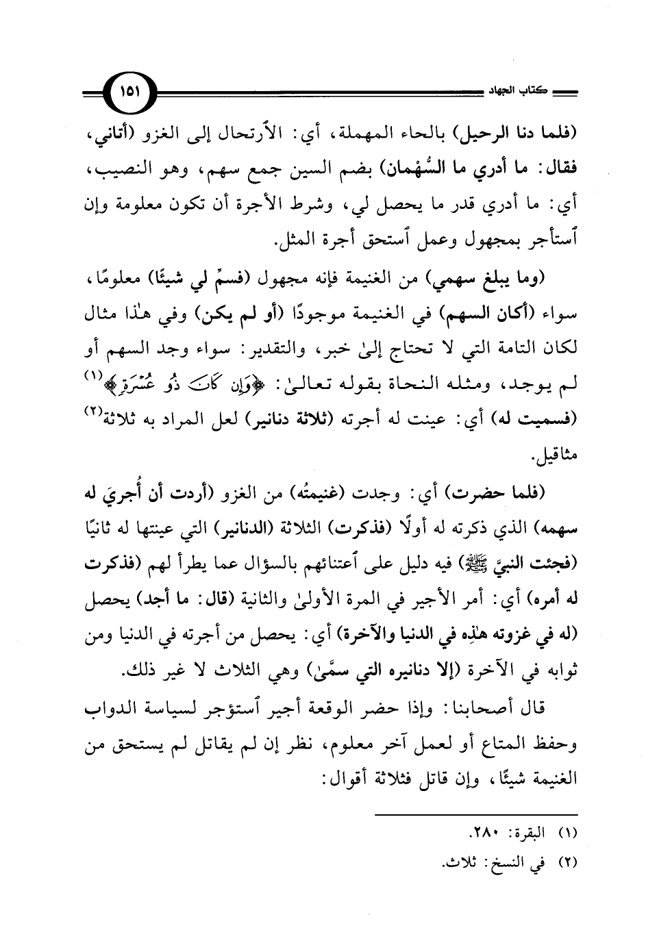 (وما يبلغ سهمي) من الغنيمة فإنه مجهول (فسمِّ لي شيئًا) معلومًا، سواء (أكان السهم) في الغنيمة موجودًا (أو لم يكن) وفي هذا مثال لكان التامة التي لا تحتاج إلى خبر، والتقدير: سواء وجد السهم أو لم يوجد، ومثله النحاة بقوله تعالى: {وَإِنْ كَانَ ذُو عُسْرَةٍ} (¬1) (فسميت له) أي: عينت له أجرته (ثلاثة دنانير) لعل المراد به ثلاثة (¬2) مثاقيل.
