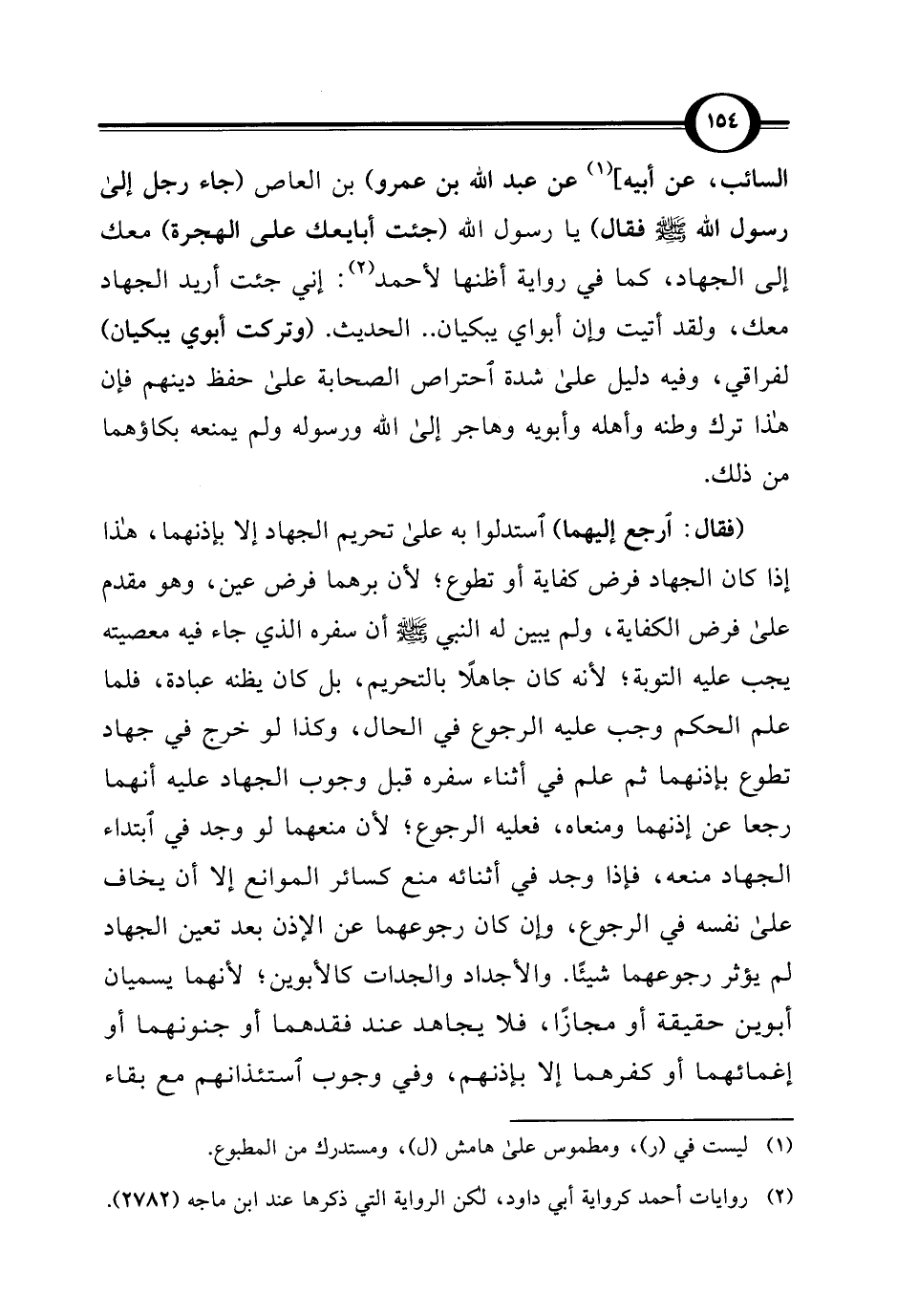 (فقال: ارجع إليهما) استدلوا به على تحريم الجهاد إلا بإذنهما، هذا إذا كان الجهاد فرض كفاية أو تطوع؛ لأن برهما فرض عين، وهو مقدم على فرض الكفاية، ولم يبين له النبي - صلى الله عليه وسلم - أن سفره الذي جاء فيه معصيته يجب عليه التوبة؛ لأنه كان جاهلًا بالتحريم، بل كان يظنه عبادة، فلما علم الحكم وجب عليه الرجوع في الحال، وكذا لو خرج في جهاد تطوع بإذنهما ثم علم في أثناء سفره قبل وجوب الجهاد عليه أنهما رجعا عن إذنهما ومنعاه، فعليه الرجوع؛ لأن منعهما لو وجد في ابتداء الجهاد منعه، فإذا وجد في أثنائه منع كسائر الموانع إلا أن يخاف على نفسه في الرجوع، وإن كان رجوعهما عن الإذن بعد تعين الجهاد لم يؤثر رجوعهما شيئًا. والأجداد والجدات كالأبوين؛ لأنهما يسميان أبوين حقيقة أو مجازًا، فلا يجاهد عند فقدهما أو جنونهما أو إغمائهما أو كفرهما إلا بإذنهم، وفي وجوب استئذانهم مع بقاء