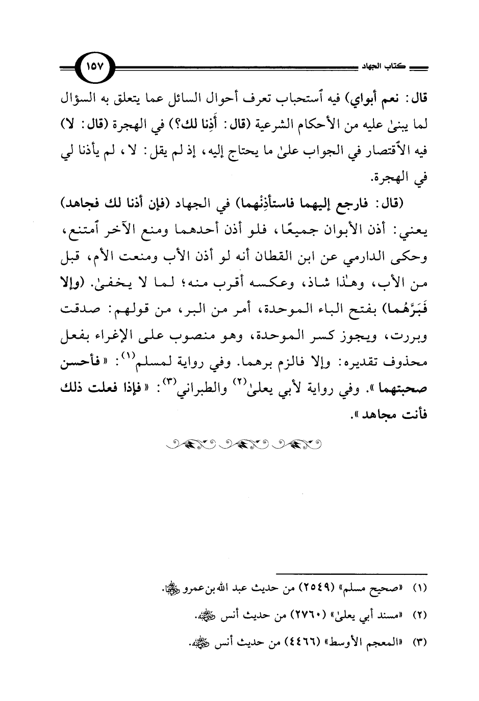 (قال: فارجع إليهما فاستأذِنْهما) في الجهاد (فإن أذنا لك فجاهد) يعني: أذن الأبوان جميعًا، فلو أذن أحدهما ومنع الآخر امتنع، وحكى الدارمي عن ابن القطان أنه لو أذن الأب ومنعت الأم، قبل من الأب، وهذا شاذ، وعكسه أقرب منه؛ لما لا يخفى. (وإلا فَبَرَّهُما) بفتح الباء الموحدة، أمر من البر، من قولهم: صدقت وبررت، ويجوز كسر الموحدة، وهو منصوب على الإغراء بفعل محذوف تقديره: وإلا فالزم برهما. وفي رواية لمسلم (¬1): "فأحسن صحبتهما". وفي رواية لأبي يعلى (¬2) والطبراني (¬3): " فإذا فعلت ذلك فأنت مجاهد".