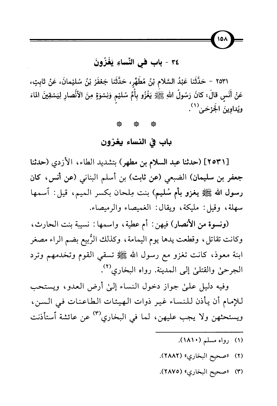 2531 - حَدَّثَنا عَبْدُ السَّلامِ بْنُ مُطَهِّرٍ، حَدَّثَنا جَعْفَرُ بْنُ سُليْمانَ، عَنْ ثابِتٍ، عَنْ أَنَسٍ قالَ: كانَ رَسُول اللهِ - صلى الله عليه وسلم - يَغْزُو بِأُمِّ سُليْمٍ وَنسْوَءة مِنَ الأنصارِ لِيَسْقِينَ الماءَ ويُداوِينَ الجَرْحَى (¬1).