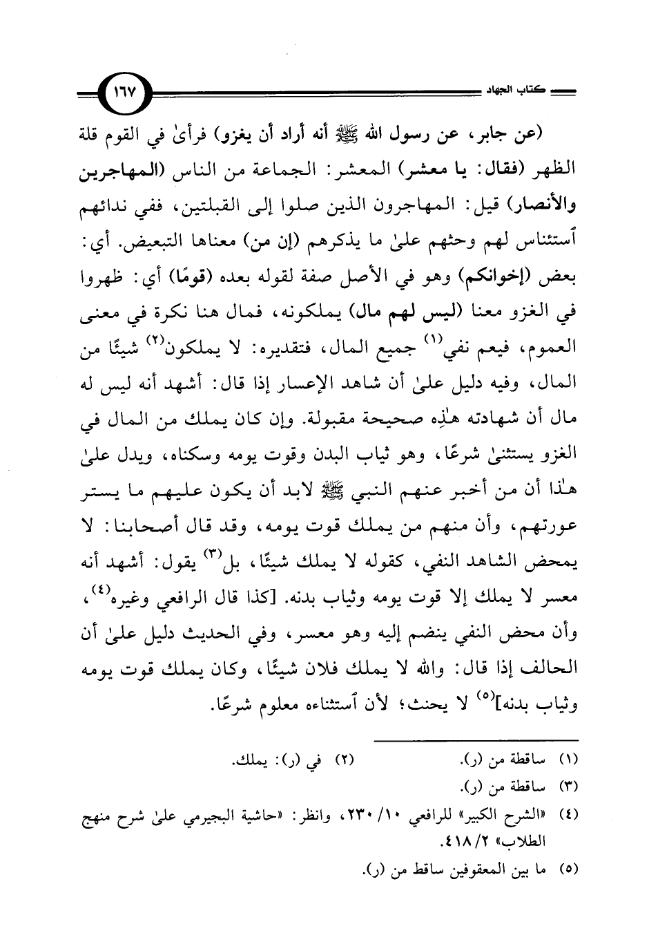(عن جابر، عن رسول الله - صلى الله عليه وسلم - أنه أراد أن يغزو) فرأى في القوم قلة الظهر (فقال: يا معشر) المعشر: الجماعة من الناس (المهاجرين والأنصار) قيل: المهاجرون الذين صلوا إلى القبلتين، ففي ندائهم استئناس لهم وحثهم على ما يذكرهم (إن من) معناها التبعيض. أي: بعض (إخوانكم) وهو في الأصل صفة لقوله بعده (قومًا) أي: ظهروا في الغزو معنا (ليس لهم مال) يملكونه، فمال هنا نكرة في معنى العموم، فيعم نفي (¬1) جميع المال، فتقديره: لا يملكون (¬2) شيئًا من المال، وفيه دليل على أن شاهد الإعسار إذا قال: أشهد أنه ليس له مال أن شهادته هذِه صحيحة مقبولة. وإن كان يملك من المال في الغزو يستثنى شرعًا، وهو ثياب البدن وقوت يومه وسكناه، ويدل على هذا أن من أخبر عنهم النبي - صلى الله عليه وسلم - لابد أن يكون عليهم ما يستر عورتهم، وأن منهم من يملك قوت يومه، وقد قال أصحابنا: لا يمحض الشاهد النفي، كقوله لا يملك شيئًا، بل (¬3) يقول: أشهد أنه معسر لا يملك إلا قوت يومه وثياب بدنه. [كذا قال الرافعي وغيره (¬4)، وأن محض النفي ينضم إليه وهو معسر، وفي الحديث دليل على أن الحالف إذا قال: والله لا يملك فلان شيئًا، وكان يملك قوت يومه وثياب بدنه] (¬5) لا يحنث؛ لأن استثناءه معلوم شرعًا.