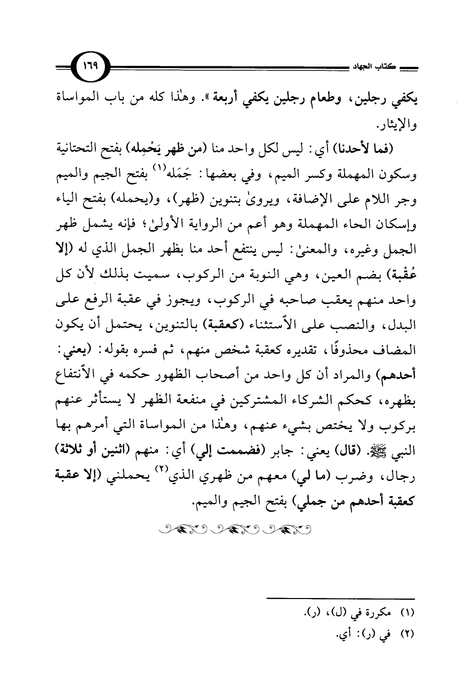(فما لأحدنا) أي: ليس لكل واحد منا (من ظهر يَحْمِله) بفتح التحتانية وسكون المهملة وكسر الميم، وفي بعضها: جَمَله (¬1) بفتح الجيم والميم وجر اللام على الإضافة، ويروى بتنوين (ظهر)، و (يحمله) بفتح الياء وإسكان الحاء المهملة وهو أعم من الرواية الأولى، فإنه يشمل ظهر الجمل وغيره، والمعنى: ليس ينتفع أحد منا بظهر الجمل الذي له (إلا عُقْبة) بضم العين، وهي النوبة من الركوب، سميت بذلك لأن كل واحد منهم يعقب صاحبه في الركوب، ويجوز في عقبة الرفع على البدل، والنصب على الاستثناء (كعقبة) بالتنوين، يحتمل أن يكون المضاف محذوفًا، تقديره كعقبة شخص منهم، ثم فسره بقوله: (يعني: أحدهم) والمراد أن كل واحد من أصحاب الظهور حكمه في الانتفاع بظهره، كحكم الشركاء المشتركين في منفعة الظهر لا يستأثر عنهم بركوب ولا يختص بشيء عنهم، وهذا من المواساة التي أمرهم بها النبي - صلى الله عليه وسلم -. (ق (ل) يعني: جابر (فضممت إلى) أي: منهم (اثنين أو ثلاثة) رجال، وضرب (ما لي) معهم من ظهري الذي (¬2) يحملني (إلا عقبة كعقبة أحدهم من جملي) بفتح الجيم والميم.