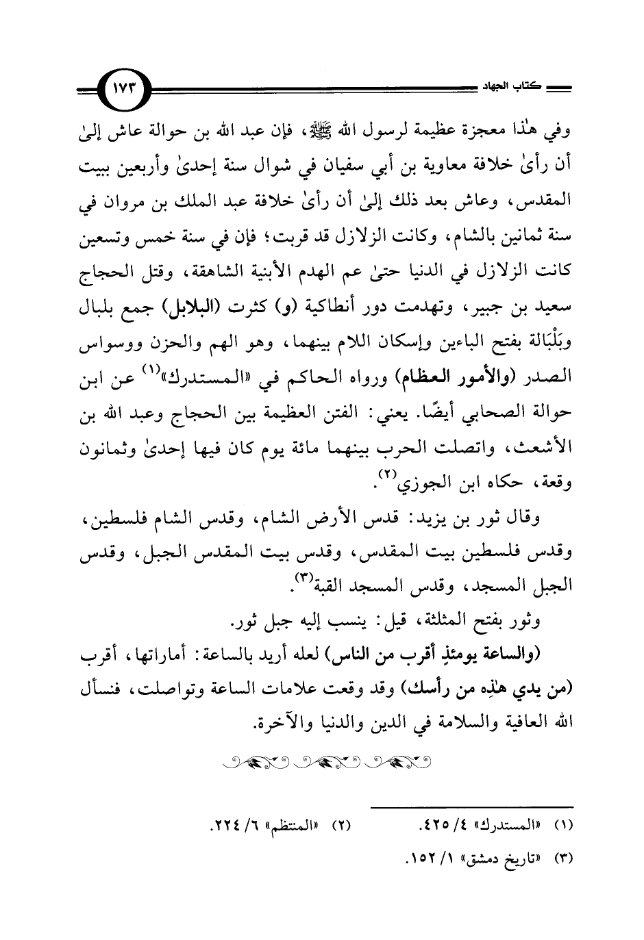 وفي هذا معجزة عظيمة لرسول الله - صلى الله عليه وسلم -، فإن عبد الله بن حوالة عاش إلى أن رأى خلافة معاوية بن أبي سفيان في شوال سنة إحدى وأربعين ببيت المقدس، وعاش بعد ذلك إلى أن رأى خلافة عبد الملك بن مروان في سنة ثمانين بالشام، وكانت الزلازل قد قربت؛ فإن في سنة خمس وتسعين كانت الزلازل في الدنيا حتى عم الهدم الأبنية الشاهقة، وقتل الحجاج سعيد بن جبير، وتهدمت دور أنطاكية (و) كثرت (البلابل) جمع بلبال وبَلْبَالة بفتح الباءين وإسكان اللام بينهما، وهو الهم والحزن ووسواس الصدر (والأمور العظام) ورواه الحاكم في "المستدرك" (¬1) عن ابن حوالة الصحابي أيضًا. يعني؛ الفتن العظيمة بين الحجاج وعبد الله بن الأشعث، واتصلت الحرب بينهما مائة يوم كان فيها إحدى وثمانون وقعة، حكاه ابن الجوزي (¬2).