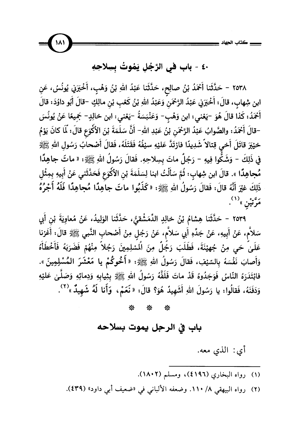 2538 - حَدَّثَنا أَحْمَدُ بْنُ صالِحٍ، حَدَّثَنا عَبْدُ اللهِ بْن وَهْبٍ، أَخْبَرَني يُونُسُ، عَنِ ابن شِهابٍ، قالَ: أَخْبَرَني عَبْدُ الرَّحْمَنِ وَعَبْدُ اللهِ بْنُ كَعْبِ بْنِ مالِكٍ -قالَ أَبُو داوُدَ: قالَ أَحْمَدُ: كَذا قالَ هُوَ -يَعْني: ابن وَهْبٍ- وَعَنْبَسَة -يَعْني: ابن خالِدٍ- جَمِيعًا عَنْ يُونُسَ -قالَ أَحْمَدُ: والصَّوابُ عَبْدُ الرَّحْمَنِ بْن عَبْدِ اللهِ - أَنَّ سَلَمَةَ بْنَ الأَكْوَعِ قالَ: لَمَّا كانَ يَوْمُ خيبَرَ قاتَلَ أَخي قِتالا شَدِيدًا فارْتَدَّ عَليهِ سيفهُ فَقَتَلَهُ، فَقالَ أَصْحابُ رَسُولِ اللهِ - صلى الله عليه وسلم - في ذَلِكَ - وَشَكُّوا فِيهِ - رَجُلٌ ماتَ بِسِلاحِهِ. فَقالَ رَسُول اللهِ - صلى الله عليه وسلم -: "ماتَ جاهِدًا مُجاهِدًا". قالَ ابن شِهابٍ: ثمَّ سَأَلتُ ابنا لِسَلَمَةَ بْنِ الأَكْوَعِ فَحَدَّثَني عَنْ أَبِيهِ بِمِثْلِ ذَلِكَ غيْرَ أَنَّهُ قالَ: فَقالَ رَسُولُ اللهِ - صلى الله عليه وسلم -: "كَذَبُوا ماتَ جاهِدًا مُجاهِدًا فَلَهُ أَجْرُهُ مَرَّتيْنِ" (¬1).