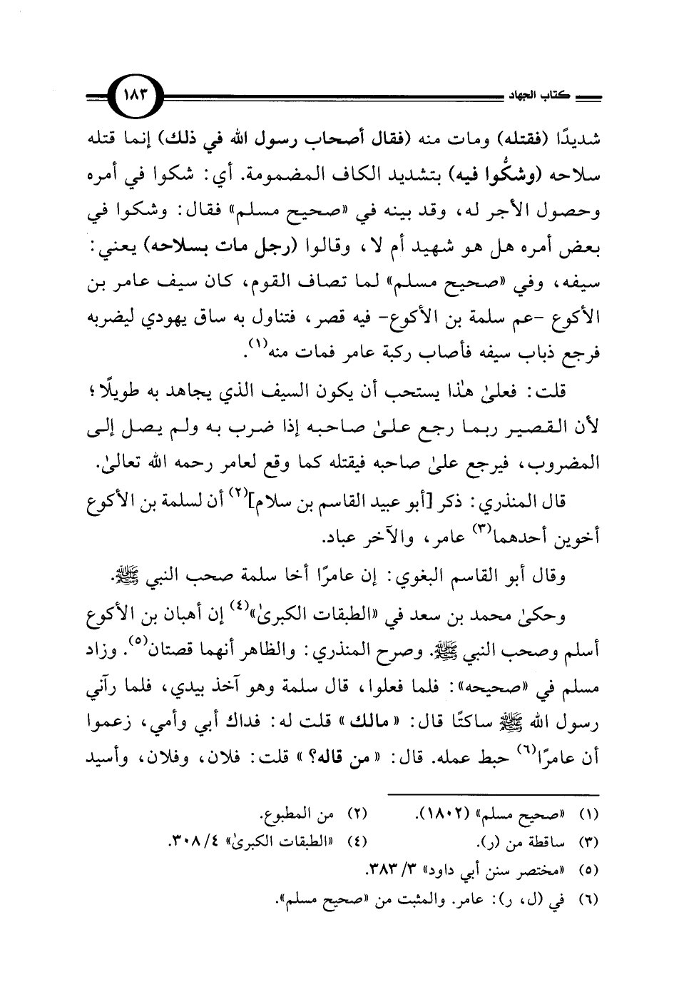 قلت: فعلى هذا يستحب أن يكون السيف الذي يجاهد به طويلًا؛ لأن القصير ربما رجع على صاحبه إذا ضرب به ولم يصل إلى المضروب، فيرجع على صاحبه فيقتله كما وقع لعامر رحمه الله تعالى.