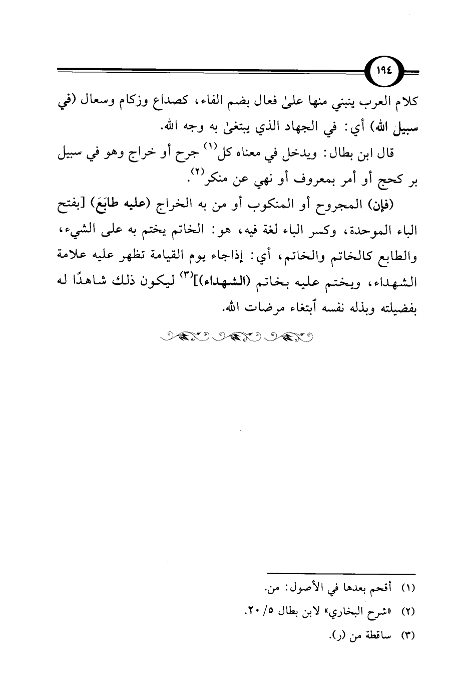(فإن) المجروح أو المنكوب أو من به الخراج (عليه طابَعَ) [بفتح الباء الموحدة، وكسر الباء لغة فيه، هو: الخاتم يختم به على الشيء، والطابع كالخاتم والخاتم، أي: إذا جاء يوم القيامة تظهر عليه علامة الشهداء، ويختم عليه بخاتم (الشهداء)] (¬3) ليكون ذلك شاهدًا له بفضيلته وبذله نفسه ابتغاء مرضات الله.